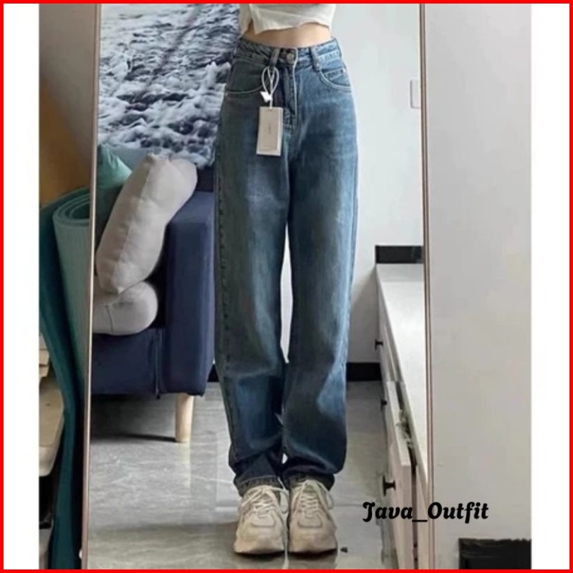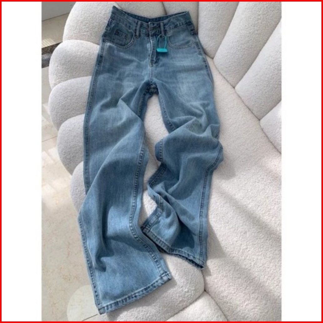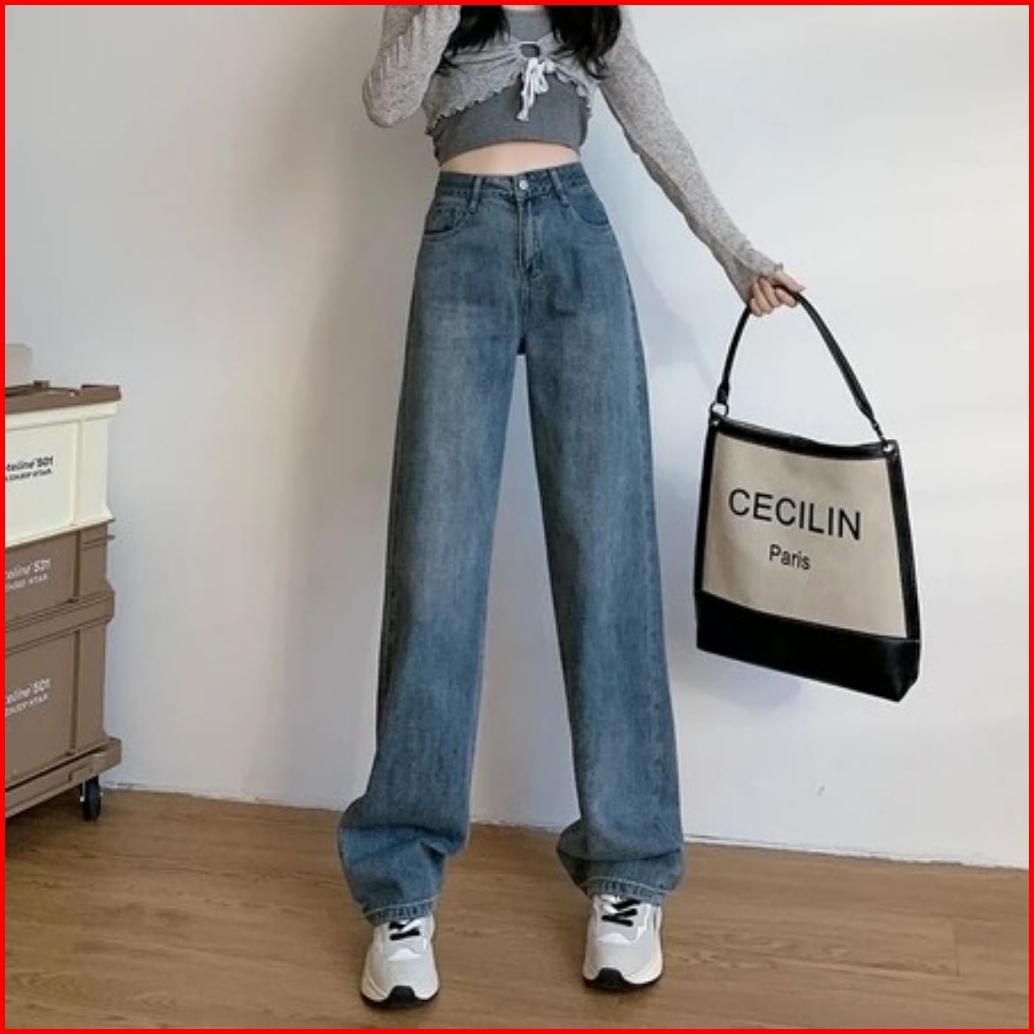 Celana Jeans High Waist Wanita Korean Style Jeans Baggy Pants Serbaguna Kasual Biru Retro