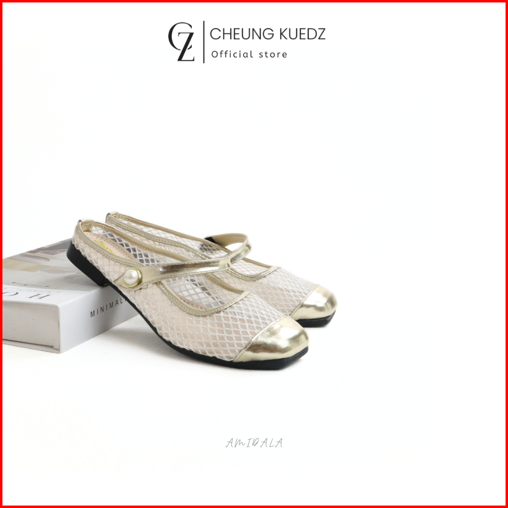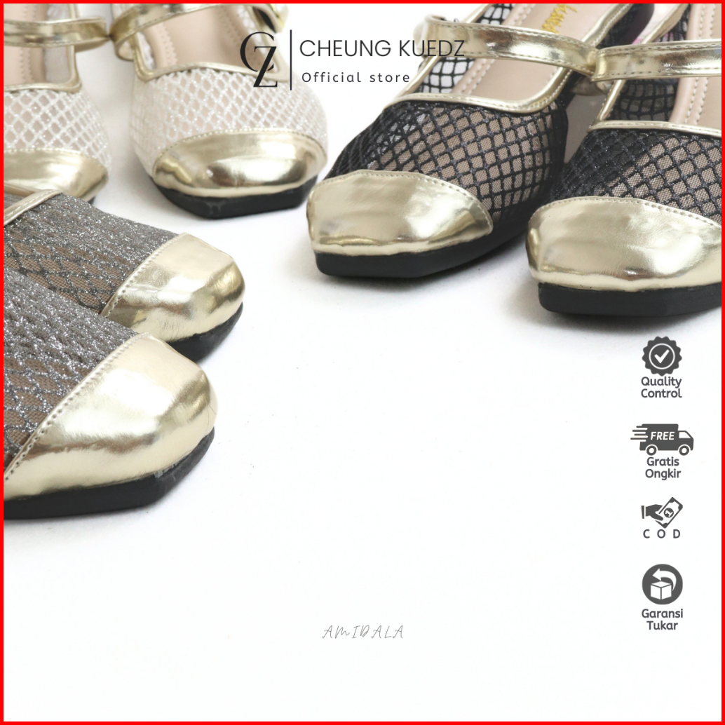 Cheung Kuedz Amidala Sandal Bustong Slop Flat Wanita Bahan Brokat