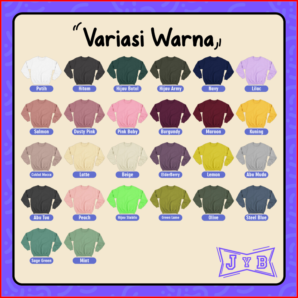 Hitam, Beige, LATTE, MOCCA, NAVY, MAROON, STEEL BLUE, Olive, Mint, SAGE GREEN, Dusty Pink, SALMON, HIJAU ARMY, HIJAU BOTOL, Lilac, BURGUNDY, BABY PINK, ALDERBERRY, Abu-abu Muda, Abu Tua, Pink Peach, REUEST WARNA LAIN