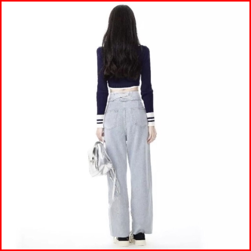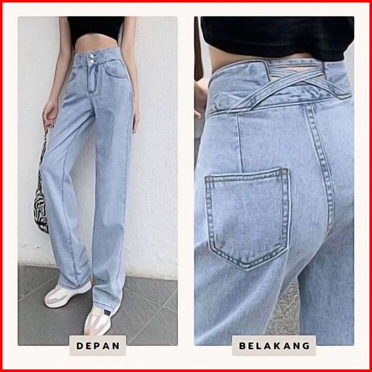 Celana Jeans Wanita High Waist Denim Cewek Silang Belakang