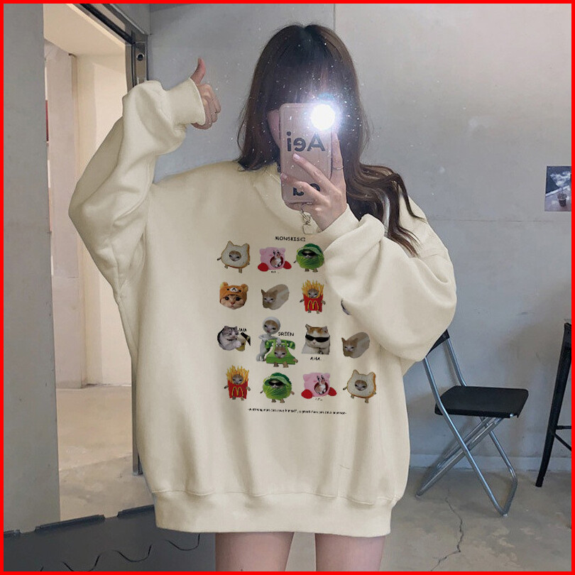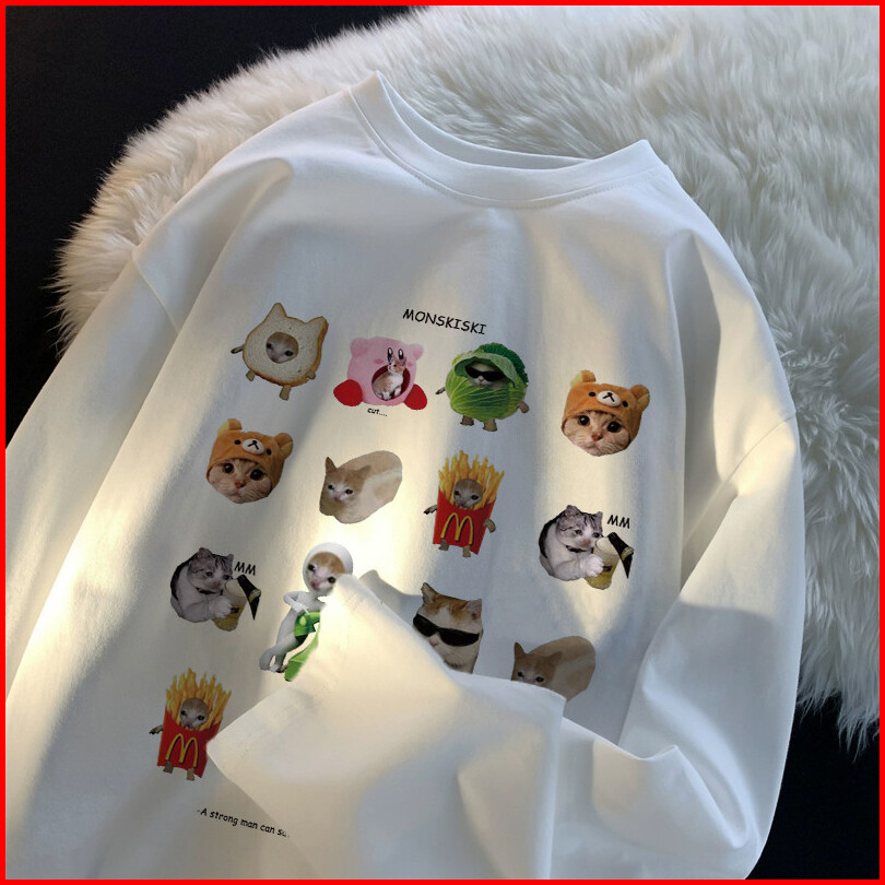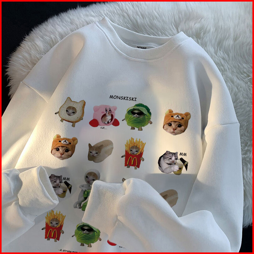 Po Floret Sweater Crewneck Oversize Wanita Cetakan Elemen Kucing Kartun Retro Style Sweater Wanita Original 100 Cotton T