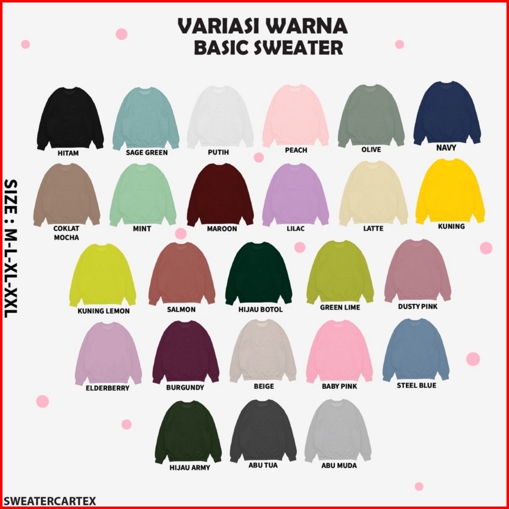 Hitam, Putih, NAVY, MAROON, Abu-abu Muda, HIJAU ARMY, COKLAT MOCCA, Lilac, LATTE/CREAM, Beige, BURGUNDY, ALDERBERRY, BABY PINK, Olive, SAGE GREEN, STEEL BLUE, Mint, HIJAU BOTOL, Abu Tua, Dusty Pink, SALMON, GREENLIME, Pink Peach, WARNA LAIN DI NOTE