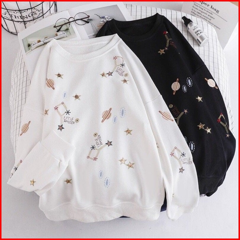 Tf - Galaxy Star Sweater Wanita Oversize Korean Style Crewneck Oblong Pria Bahan Fleece Allsize