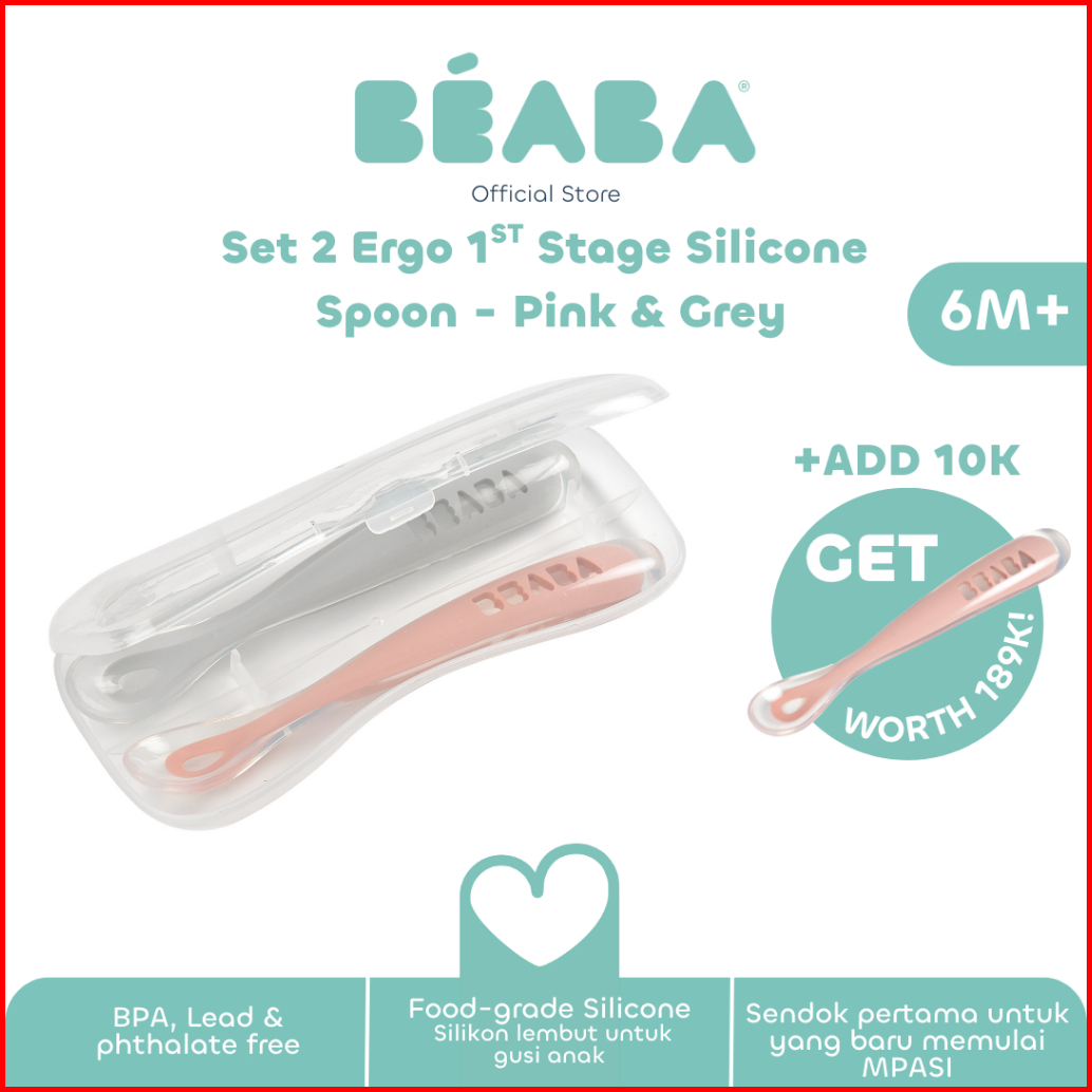 Tebus Murah 10 Ribu Beaba Set 2 Ergo 1st Stage Silicone - Sendok Makan Bayi Isi 2 Pcs Twin Pack Silikon Silicone Food Gr