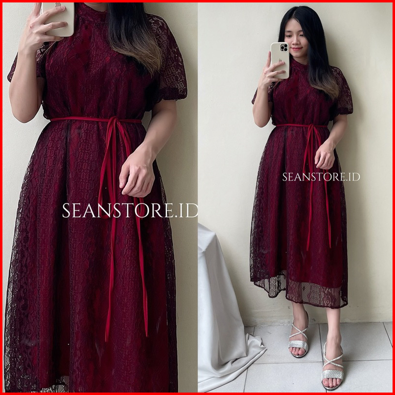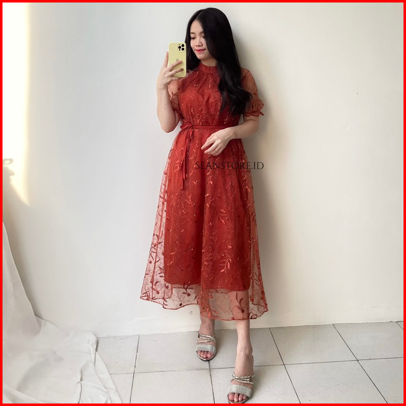 Premium Owelia Midi Brukat Dress Pesta Natal Wanita Outfit Pesta Kondangan Feminim Promnight Dress Dress Gereja Dress Na
