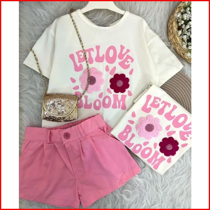 Setelan Anak Perempuan 1-5 Tahun Let Love Bloom Kaos Motif Bunga Lucu Celana Pendek Pink