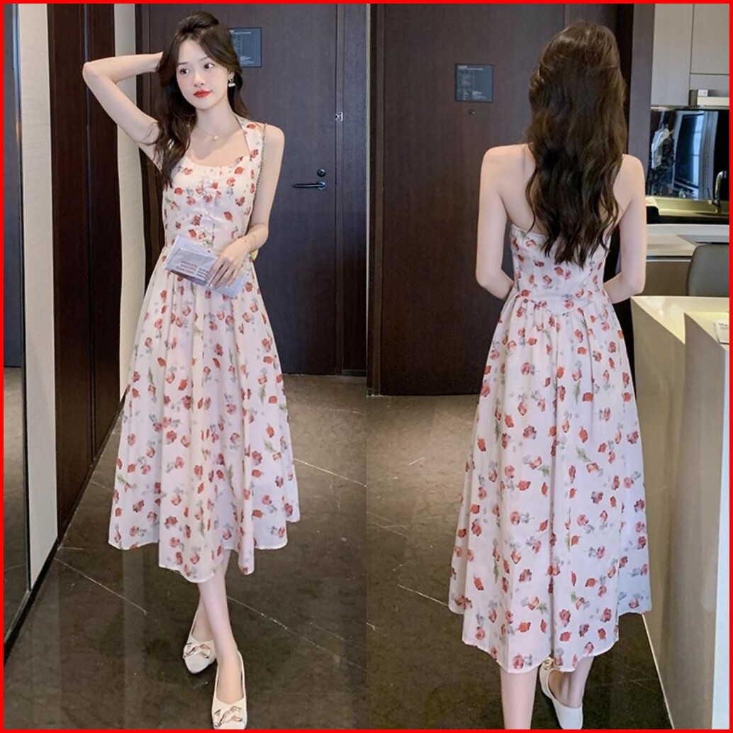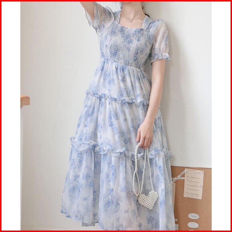 Meirong Flowy Dress Pantai Panjang Biru Muda Wanita Korea Style Jumbo Party Floral Dress Elegant