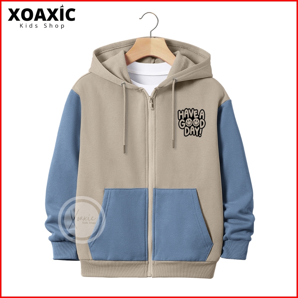 Jaket Hoodie Zipper Anak Umur 3-13 Tahun Kombinasi Warna Motif Sablon Have A Good Day Bahan Fleece Tebal Premium