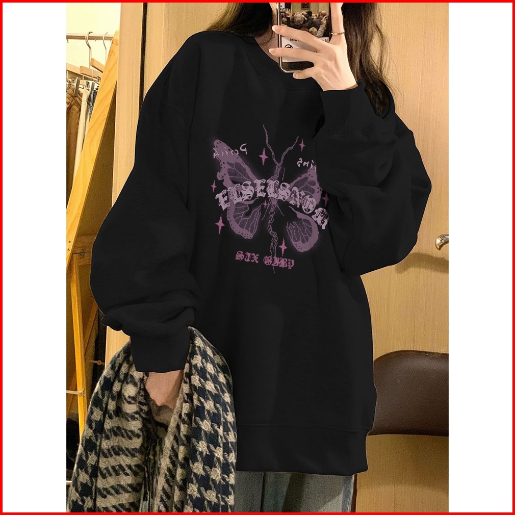 Po Floret Sweater Crewneck Oversize Wanita Siluet Kupu-kupu Bintang Retro Retro Style Sweater Wanita Original 100 Cotton