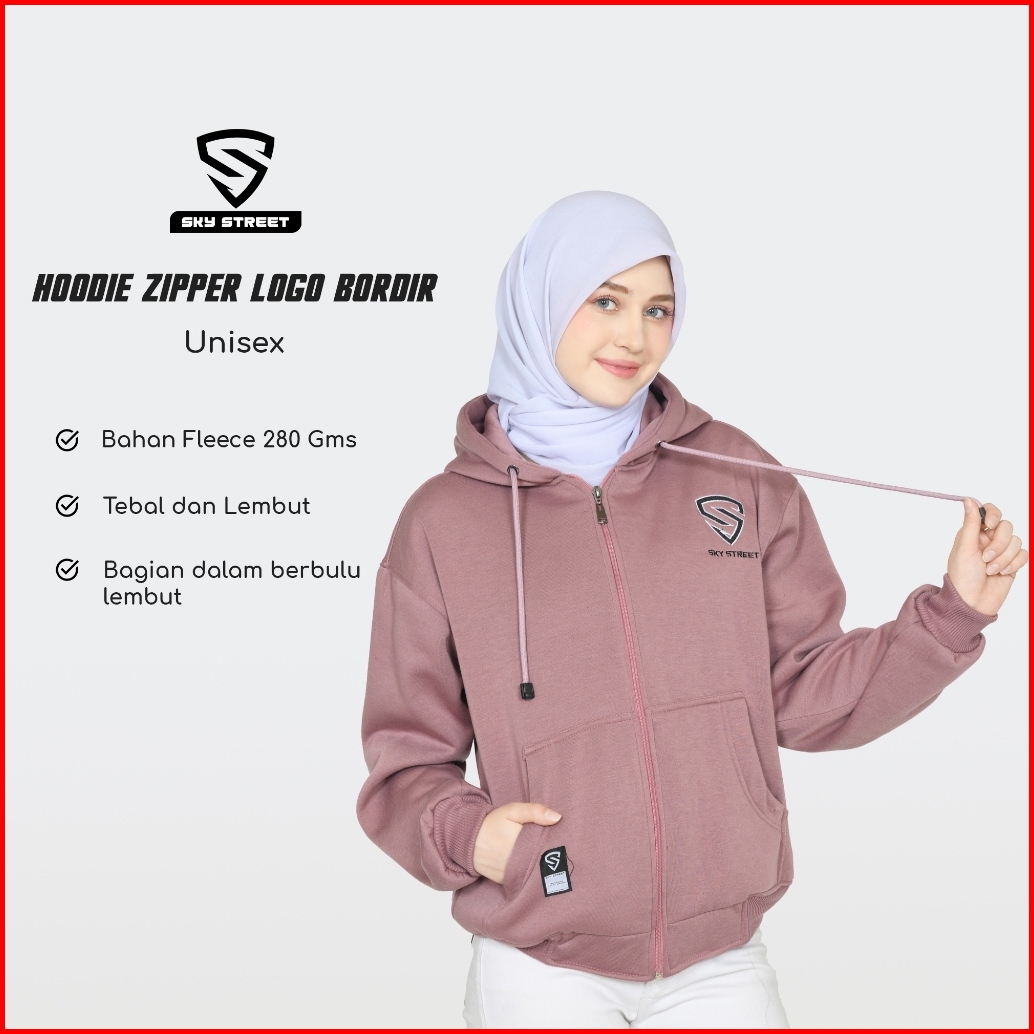 Sky Street Hoodie Sweater Jacket Zipper Resleting Logo Bordir 280 Gms Tebal Lembut Pria Wanita Bahan Fleece Distro Premi