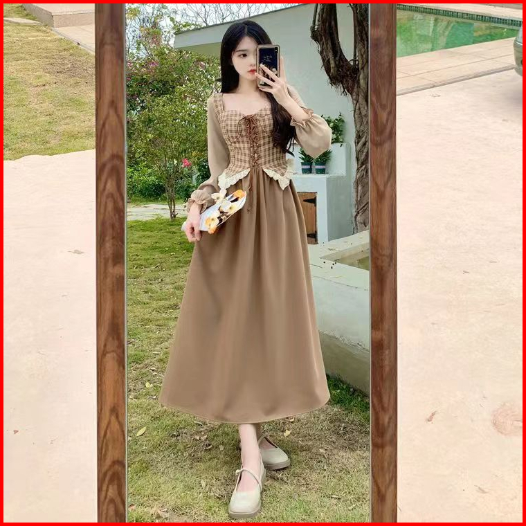Hijab Friendlydress Perancis Lengan Panjang Kotak Kotak Coklat Vintage