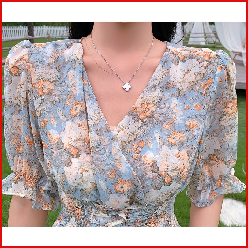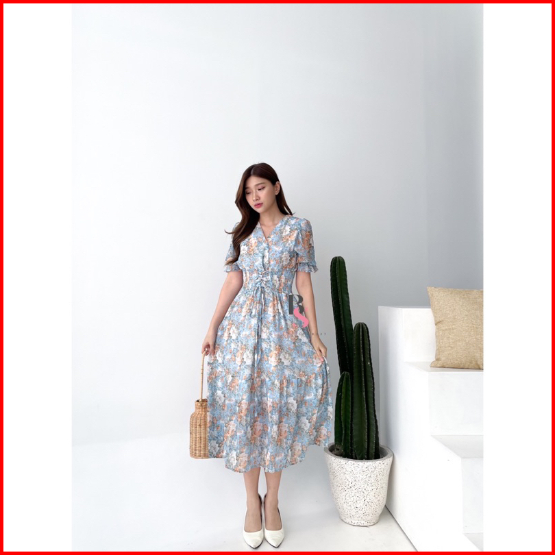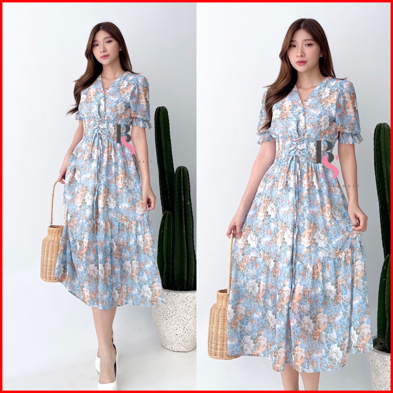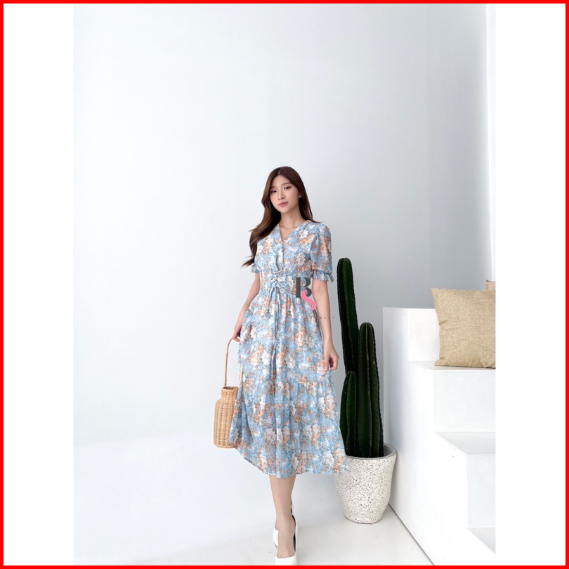 D0637 Michi Korean Style Floral Maxi Vintage Dress Bumil Friendly Liburan Jalan Santai Pantai Bali Bunga Manis Vneck