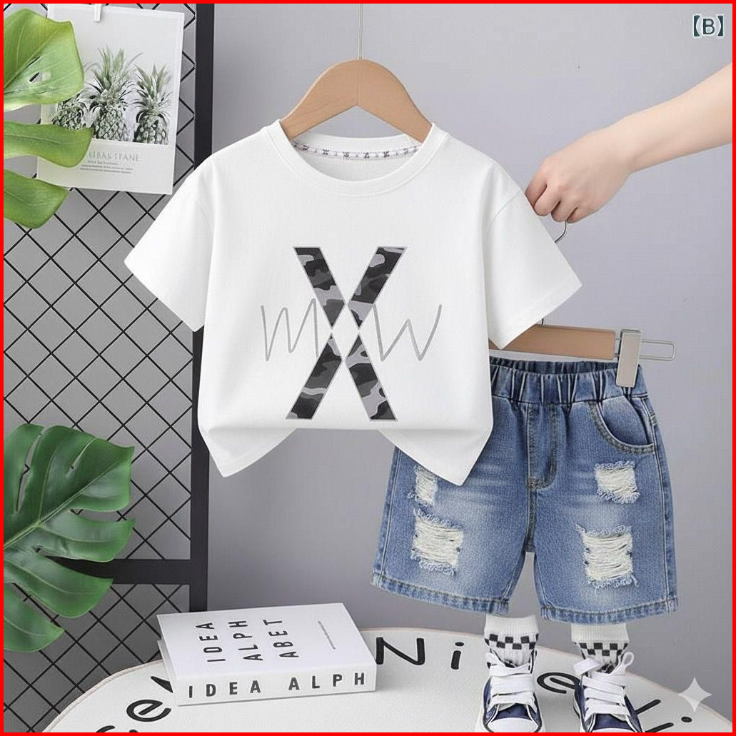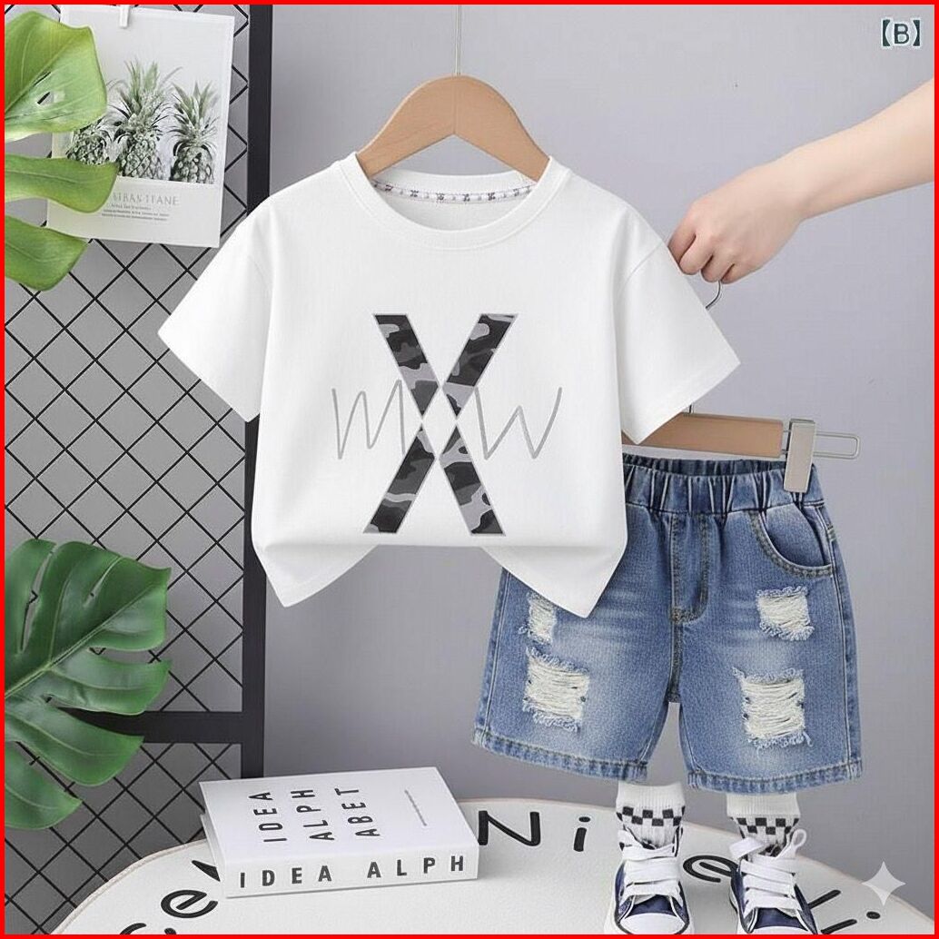 Setelan Anak Laki-laki Keren 1-5 Tahun Kaos X Celana Jeans Pendek
