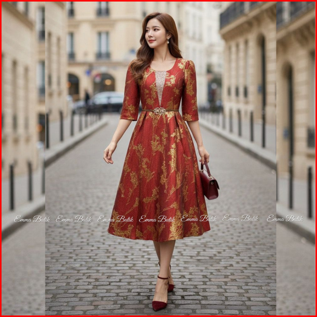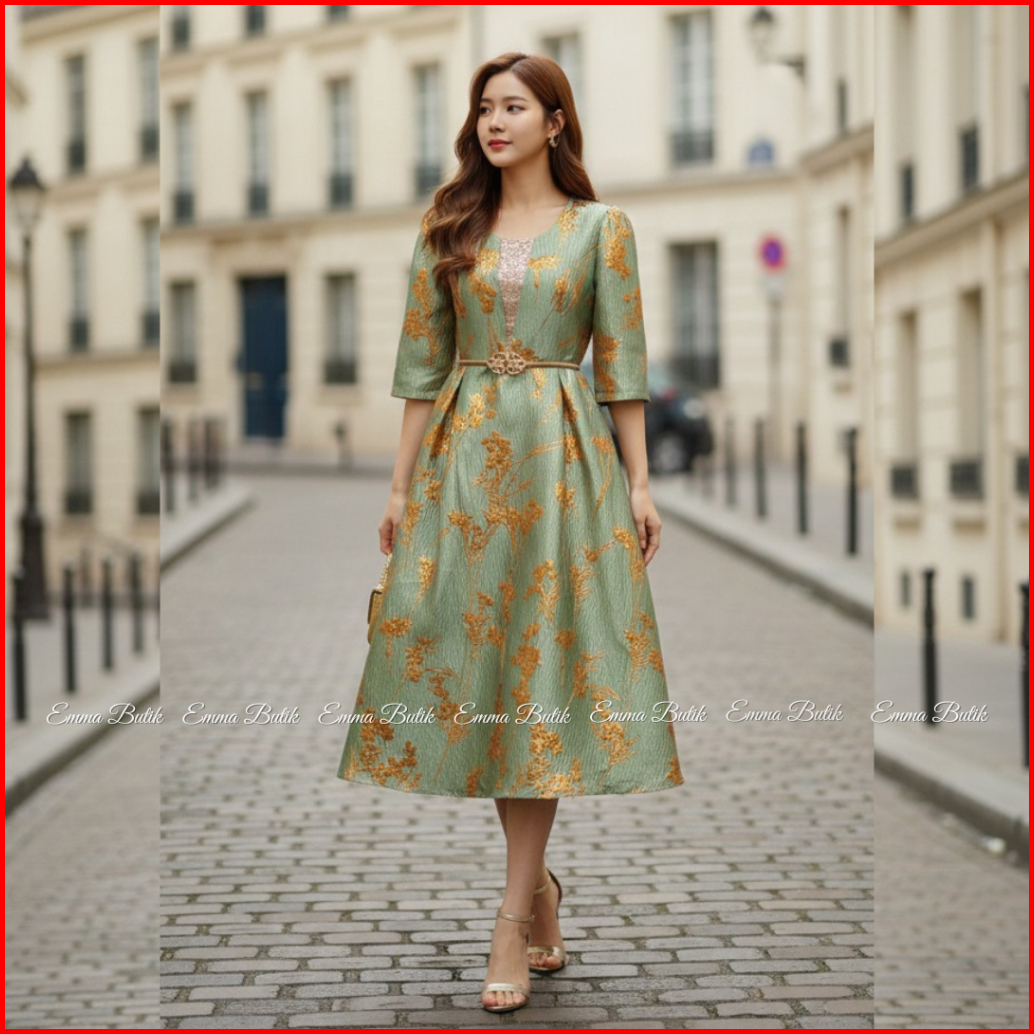 Emma.butik E00556 Gaun Jacquard Bkk Mewah Dress Pesta Wanita Glamour Gaun Kondangan Bunga Elegan Cantik Panjang