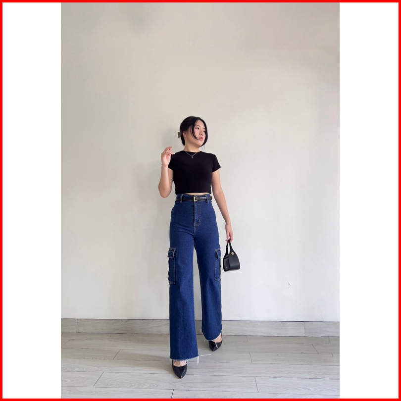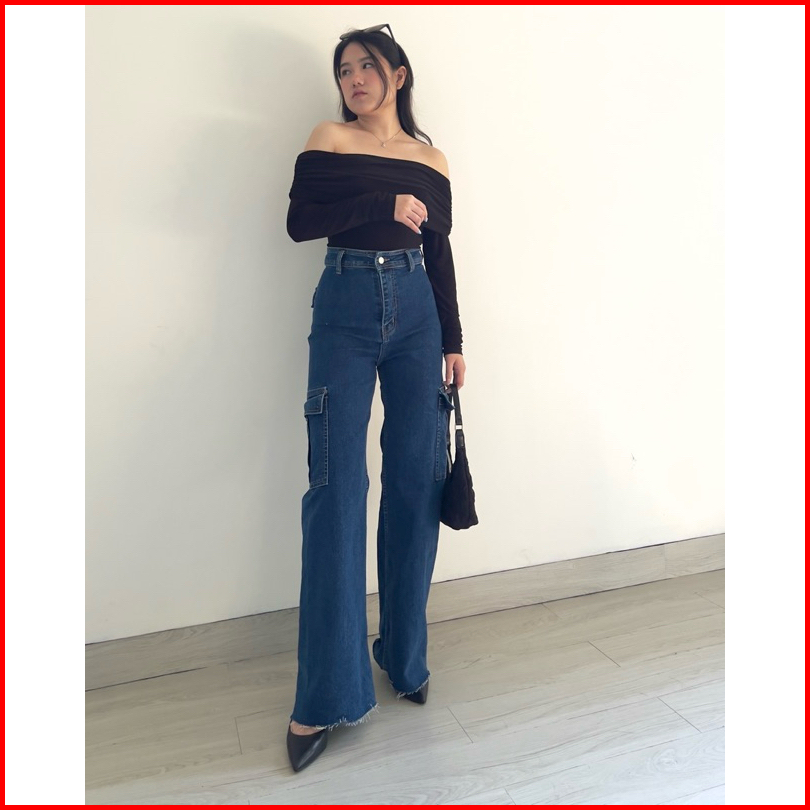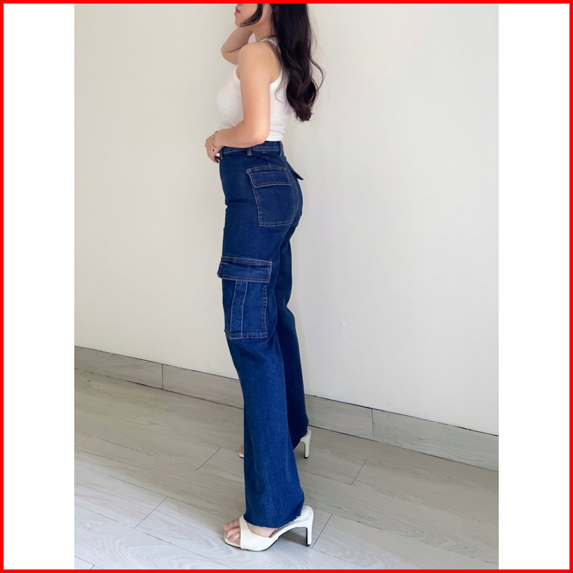 Klavee - Atlas Cargo Denim Jeans Stretch Celana Jeans Stretch Cargo Wanita Korean Style Loose Fit Stretch Melar