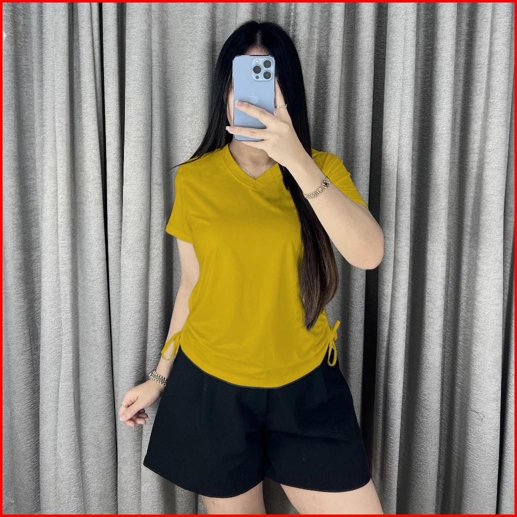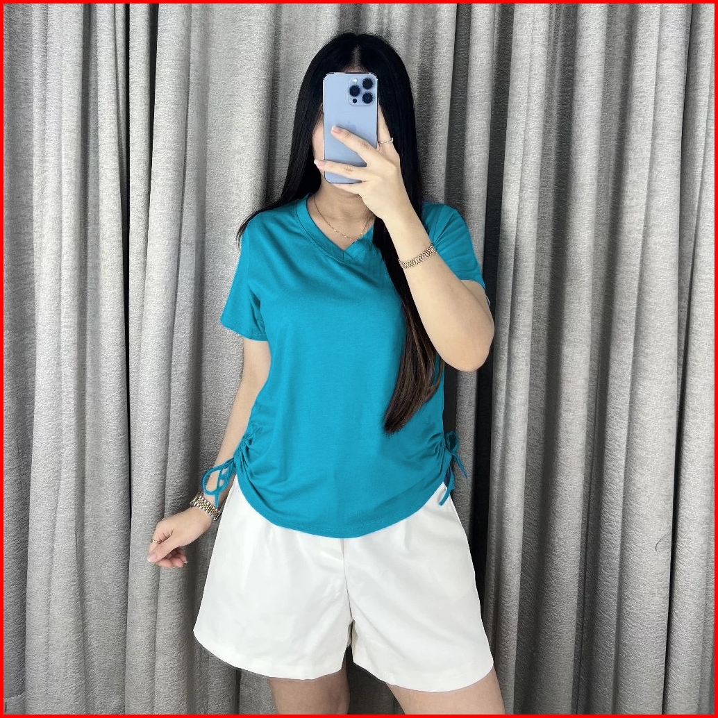 Atasan Wanita Serut Samping Leher V Kaos Wanita Lengan Pendek V Neck 8015