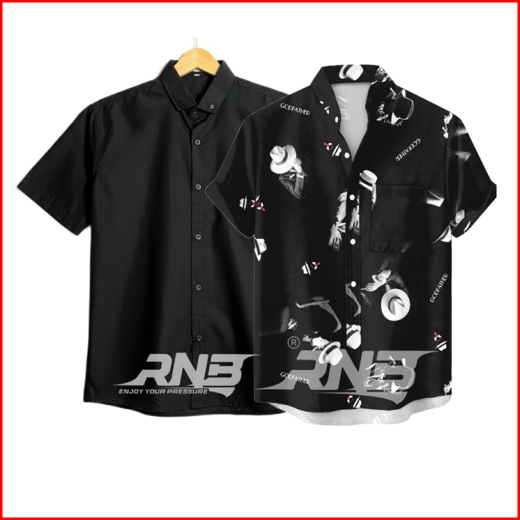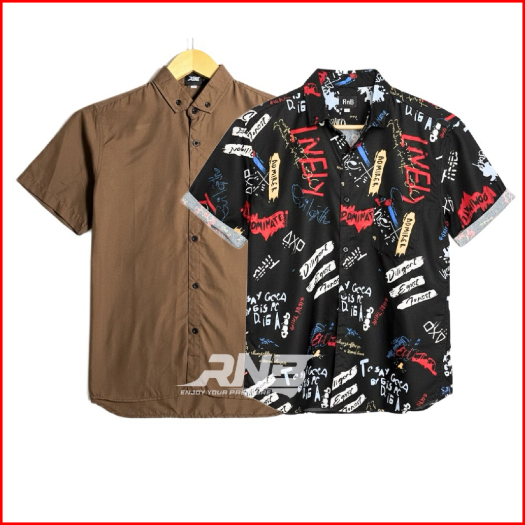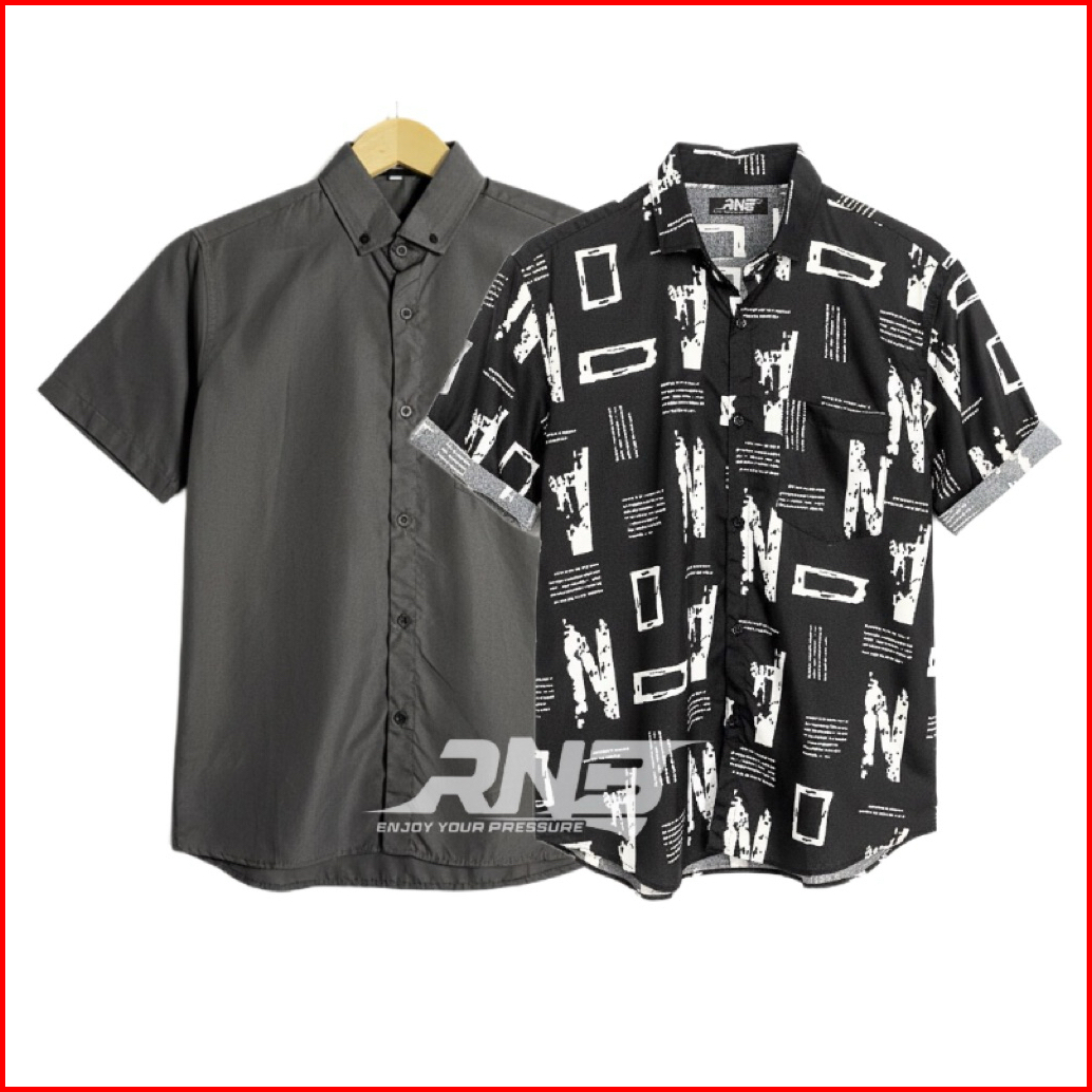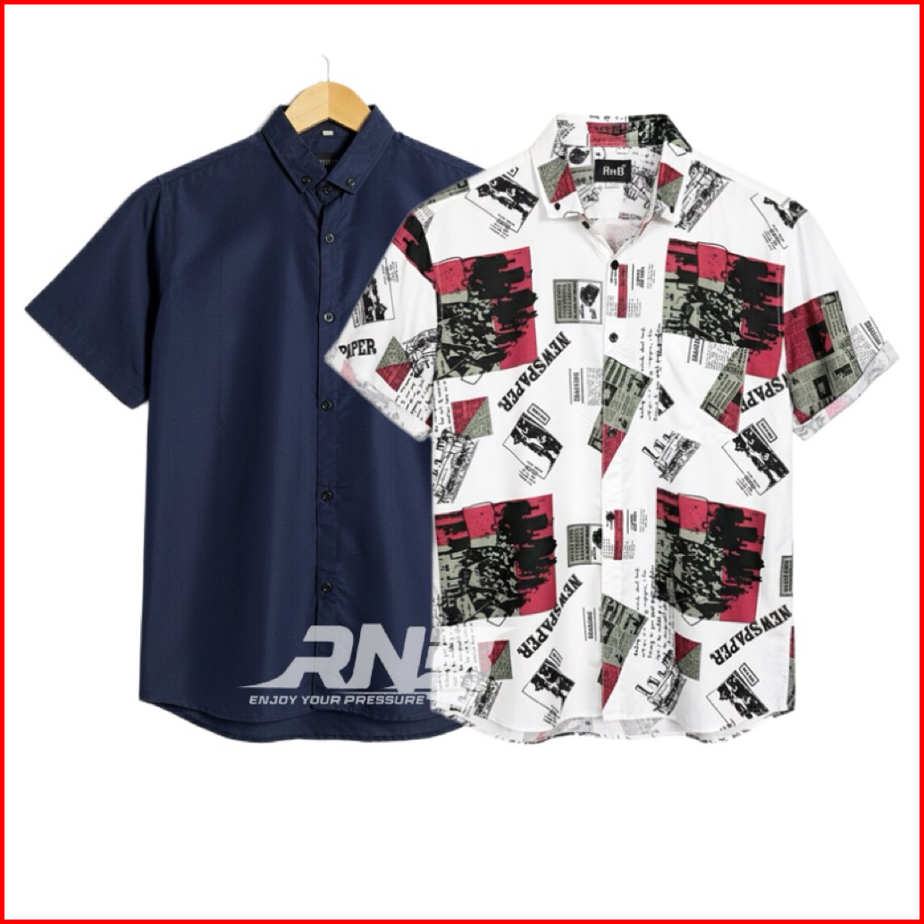 Paket 2 Pcs Kemeja Polos Dan Motif Surfing Printing Lengan Pendek M L Xl Xxl Xxxl