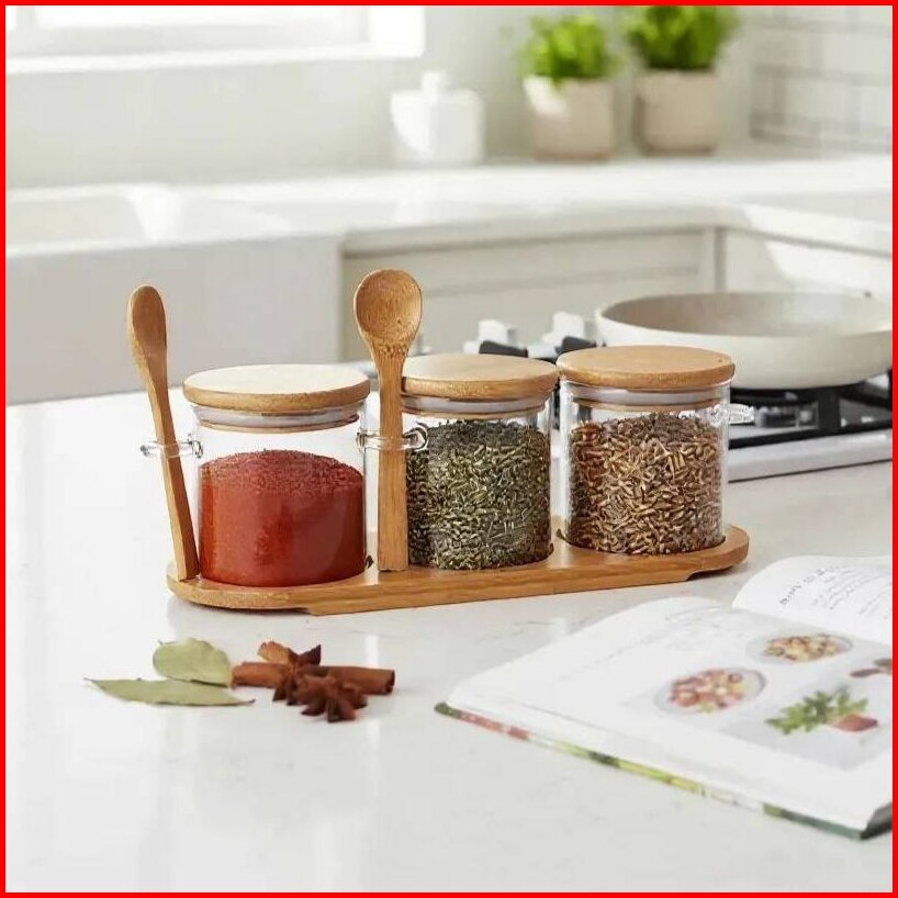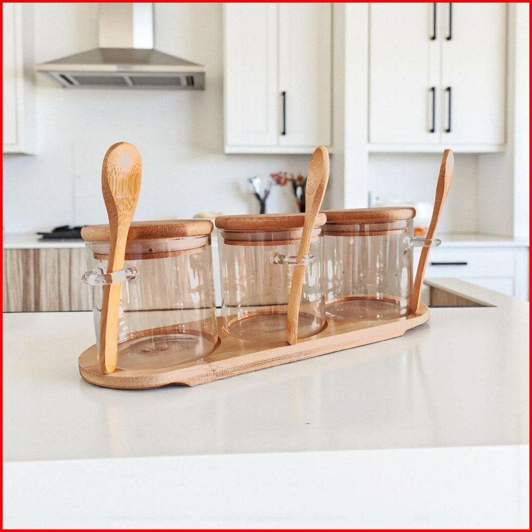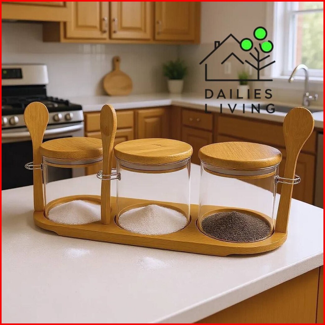Dailies Tovi Set 3 Toples Kaca Sendok Tutup Alas Kayu Wadah Kaca Bumbu Dapur Serbaguna