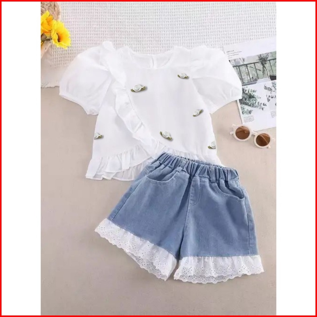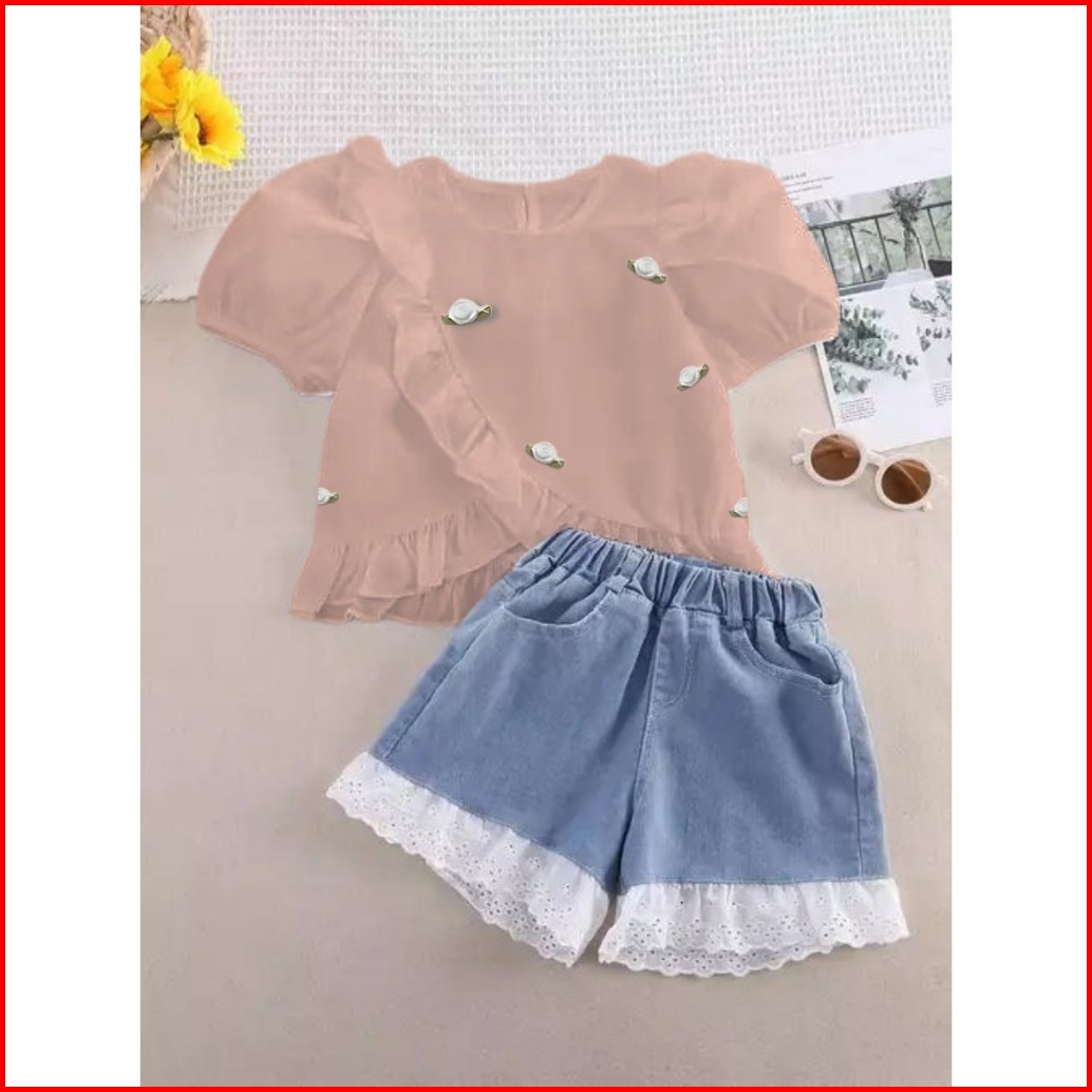 Setelan Anak Perempuan Cantik 1-5 Tahun Blouse Bunga Dan Celana Denim Renda