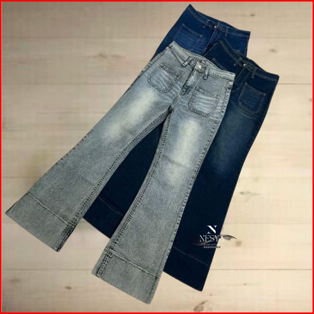 Aice Celana Jeans Pocket Stretch - Highwaist Cutbray Jeans Retro Lipat Lebar - Flare Jeans Retro Vintage Panjang
