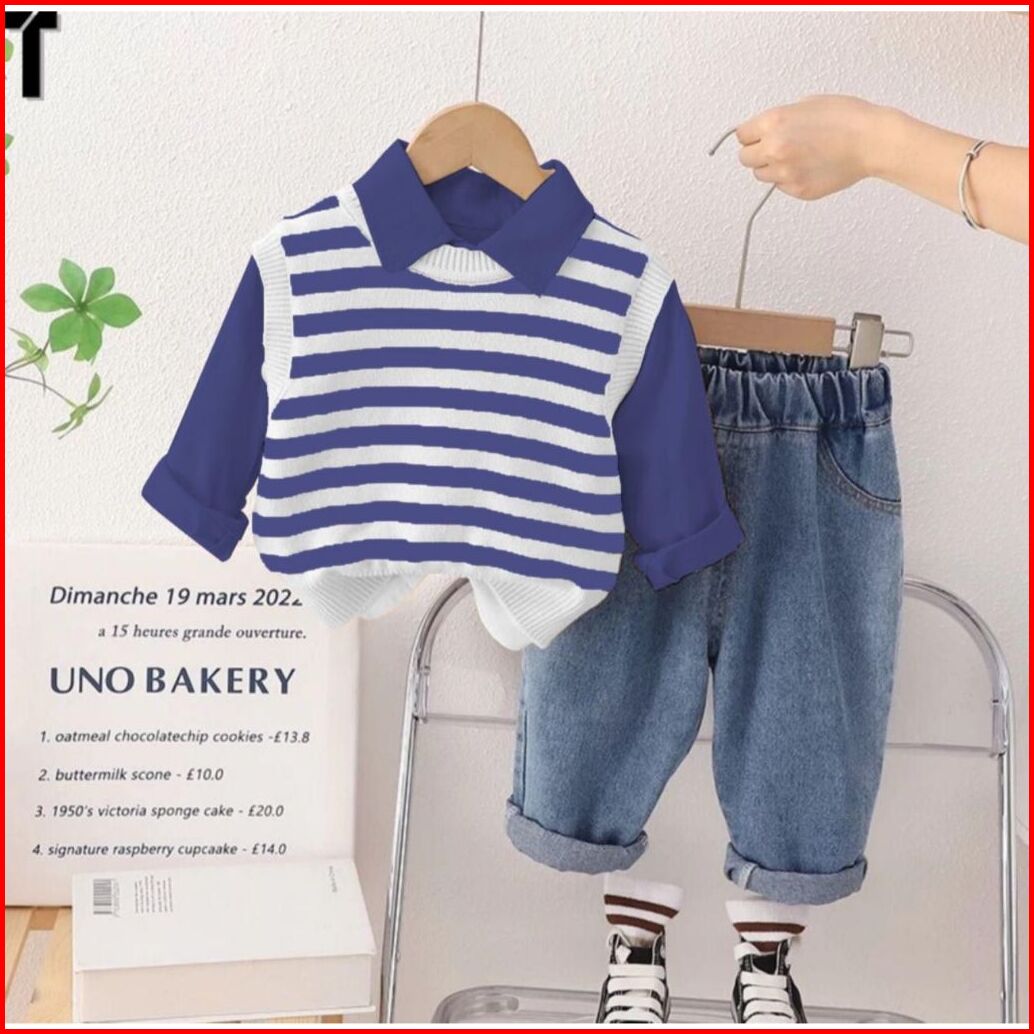 Setelan Anak 1-5 Tahun 3in1 Kemeja Vest Celana Motif Rajut Salur Terbaru Kekinian