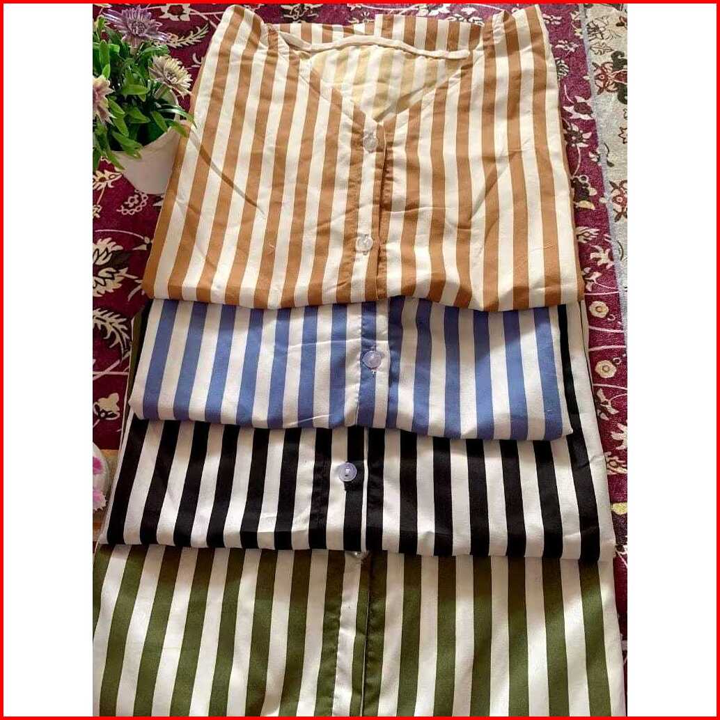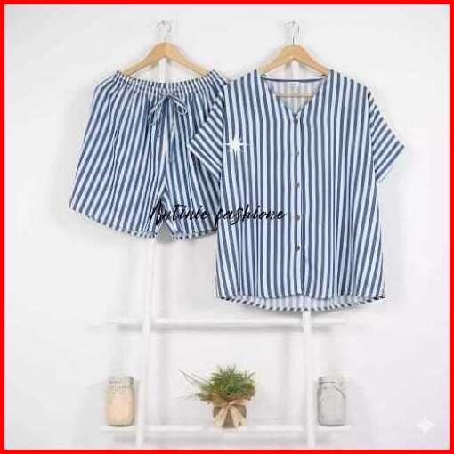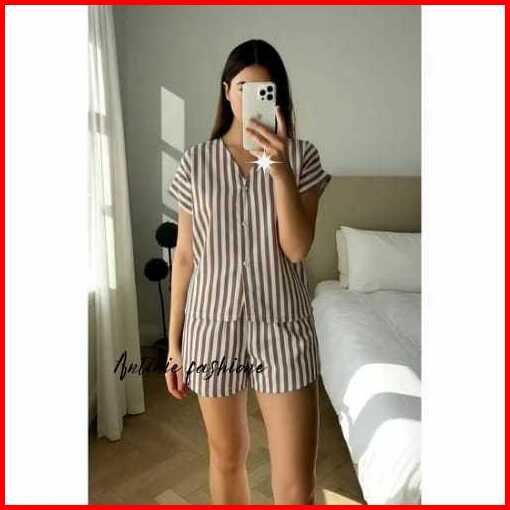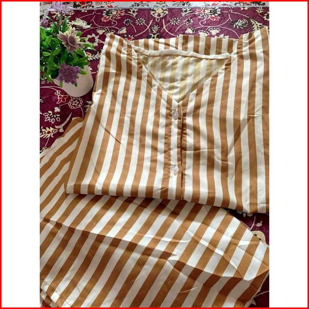 Big Promo Piyama Pendek Wanita Katun Rayon Lembut Setelan Kemeja Baju Tidur Kekinian Motif Salur