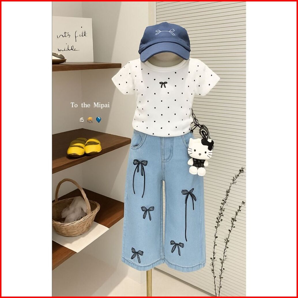 Setelan Anak Perempuan 1-5 Tahun Polkadot Pita Jeans Lucu