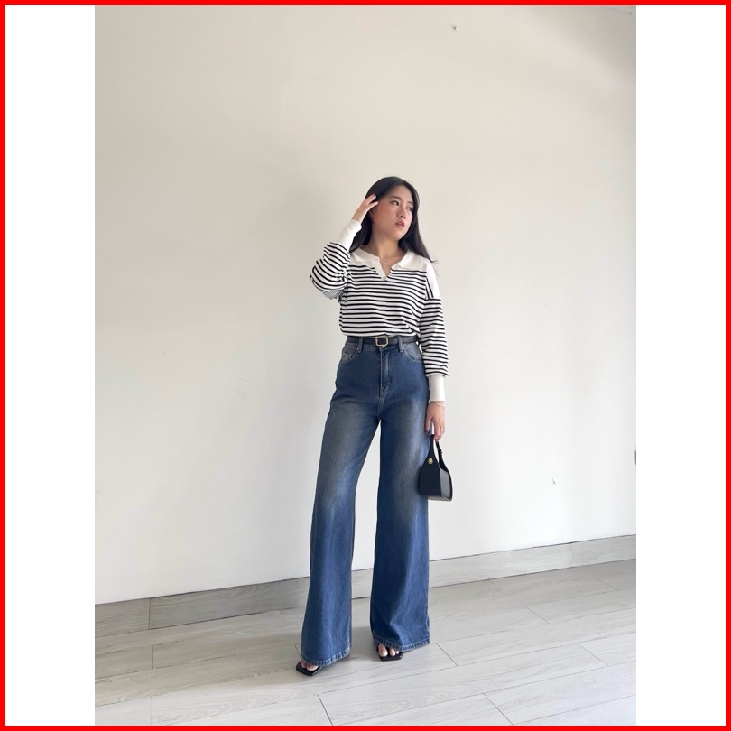 Klavee - Haerin Knit Sweater Top Atasan Lengan Panjang Wanita Rajut Melar Halus Garis Korean Style