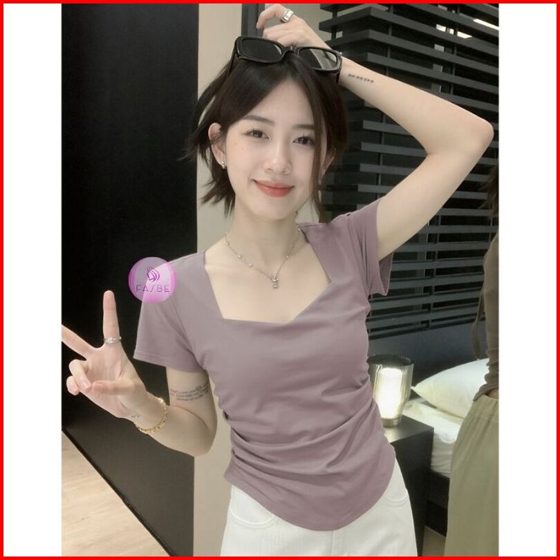 Kaos Wanita Square Neck Lengan Pendek Atasan Wanita V Neck Kekinian 911