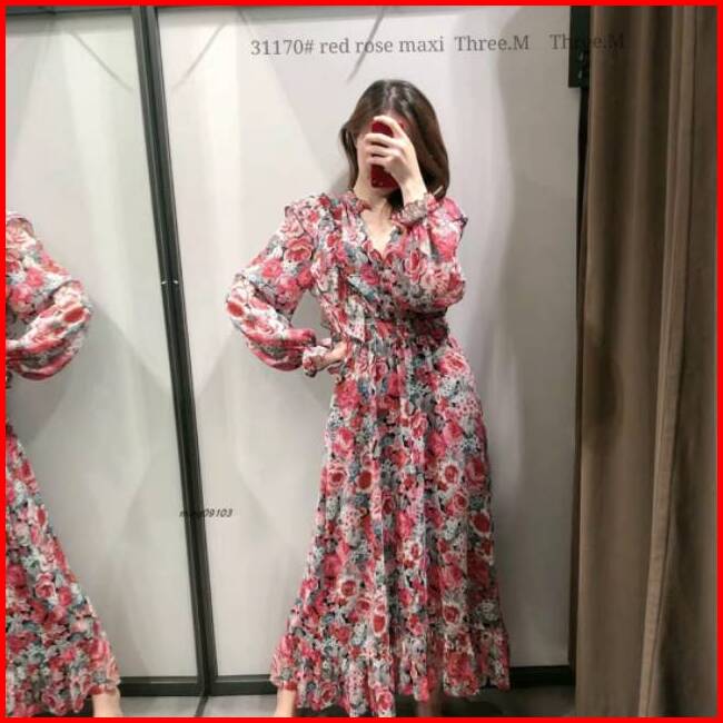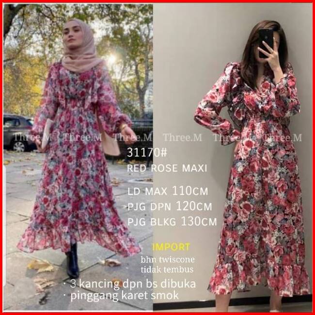 Dress 31170 3m Three M Tm Red Rose Maxi Perempuan Pakaian Wanita Fashion Grosir Berkualitas Import