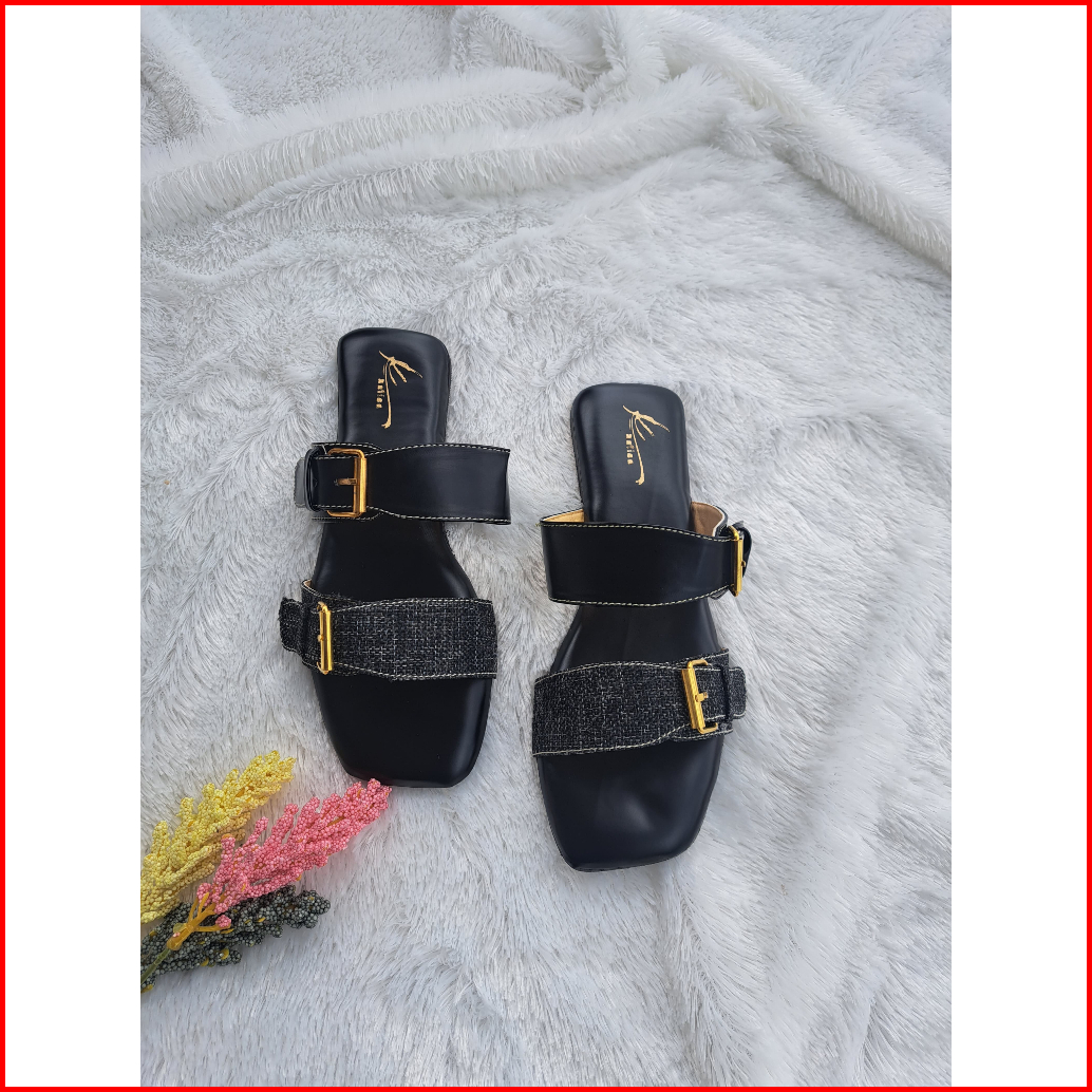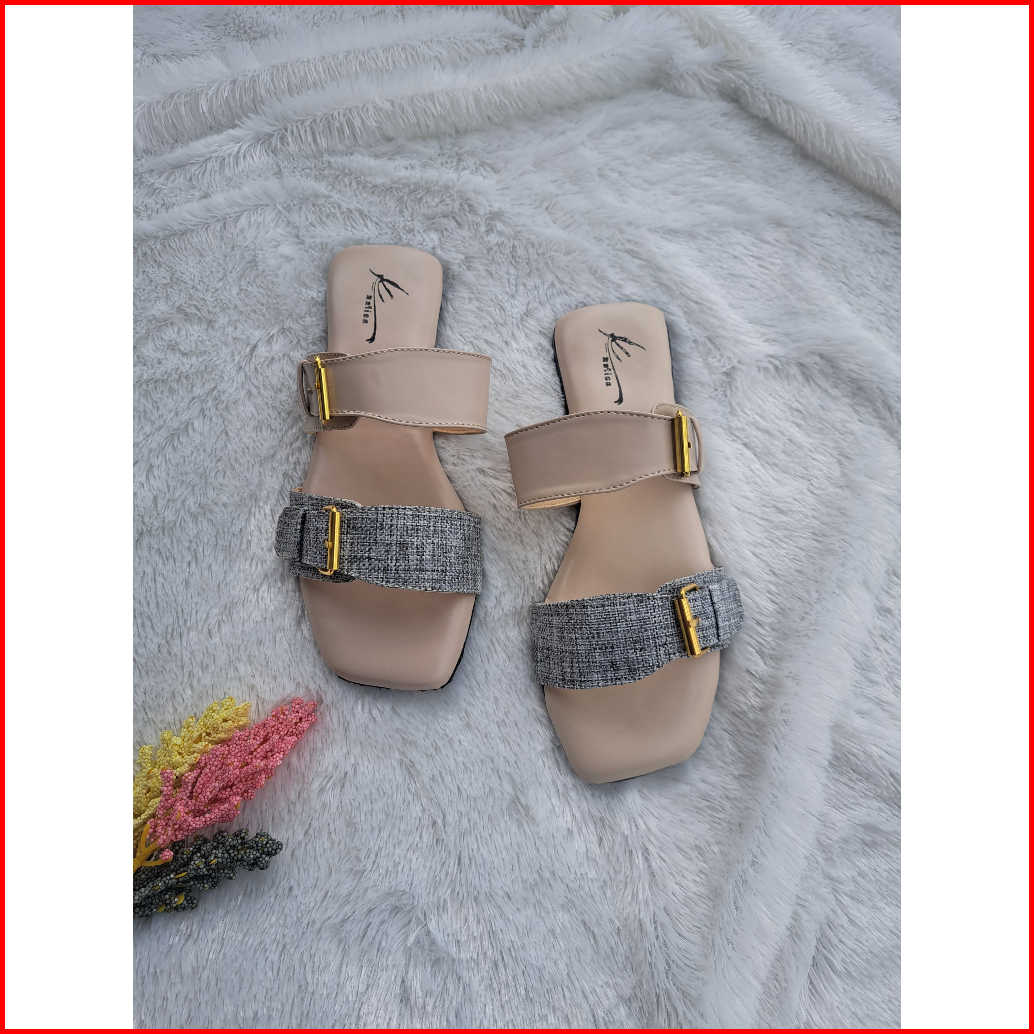 Sandal Double Strap Wanita Flat Teplek Gesper Ban 2 Elegan