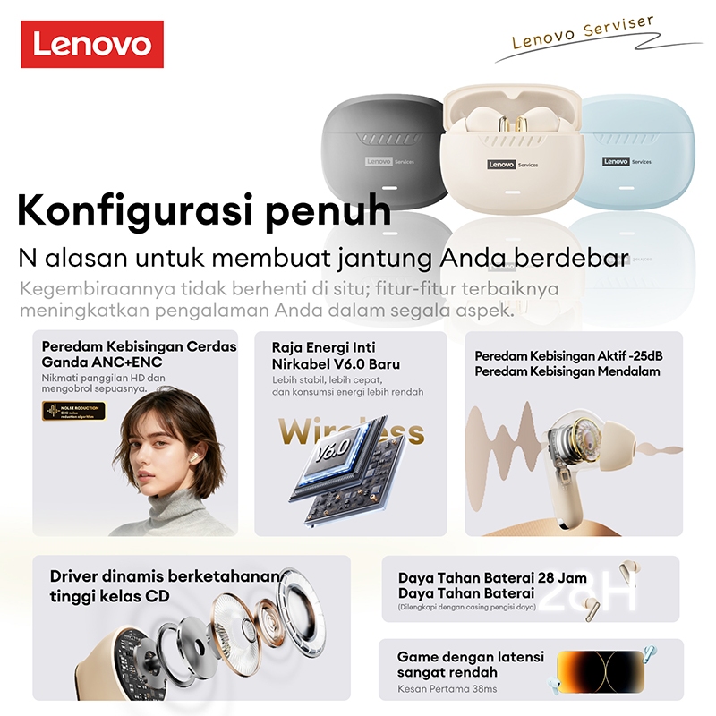 Lenovo Thinkplus LE217 TWS True Wirless Earphone Bluetooth Upgraded 6.0 -25dB ANC Noise Reduction 38ms Low Delay Music/Gaming Headset