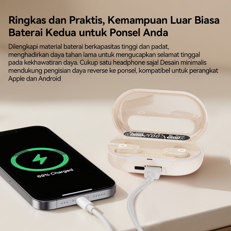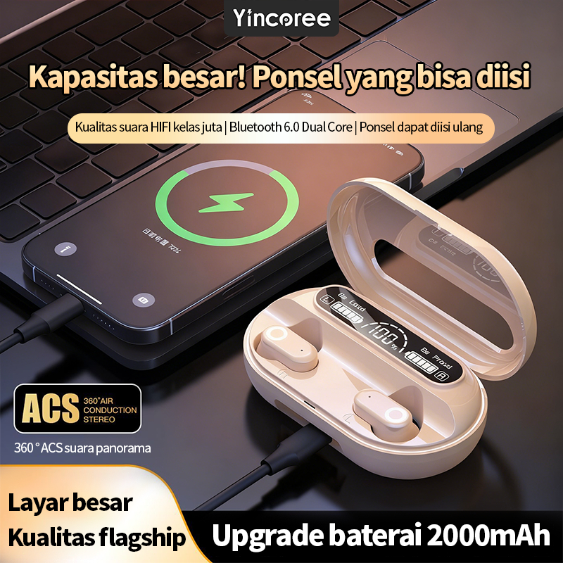 Yincoree J22 TWS Earphone Bluetooth 2 in 1 dengan Power Bank, Tampilan Digital Baterai, Kontrol Sentuh, Kualitas Audio Hi-Fi