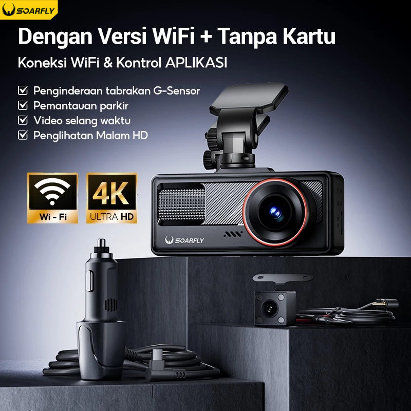 Soarfly Dashcam Mobil WIFI 4K GPS Layar Night Vision Dual Lens Perekaman Loop 24 Jam