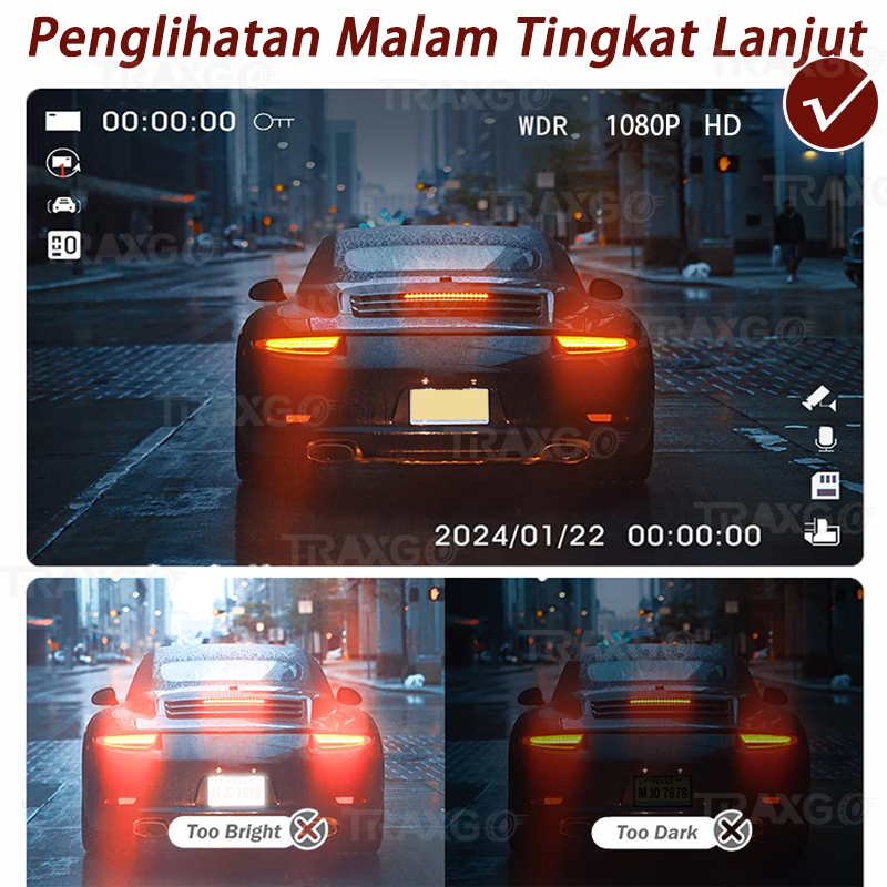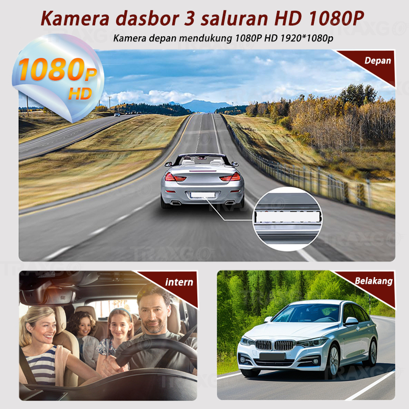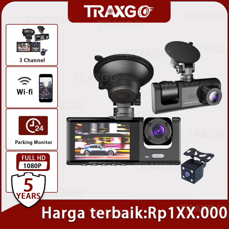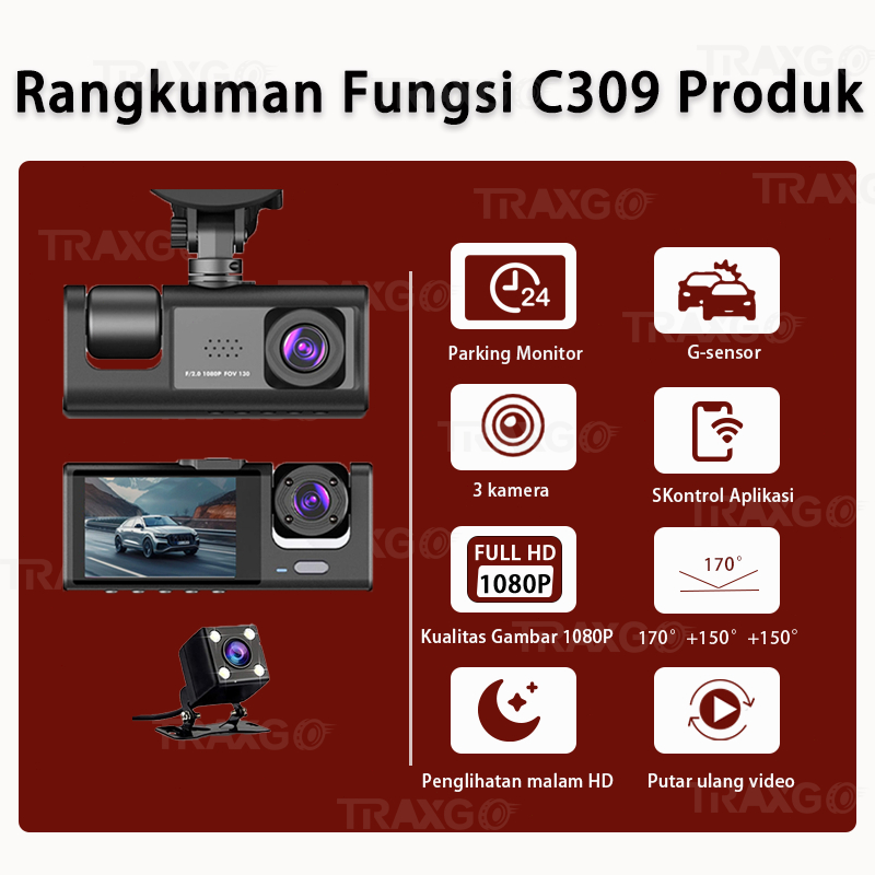 C309 Dash Cam WiFi Mobil - 1080P Full HD 3 Lens, Kamera Belakang + Park Assist, APP View, Night Vision