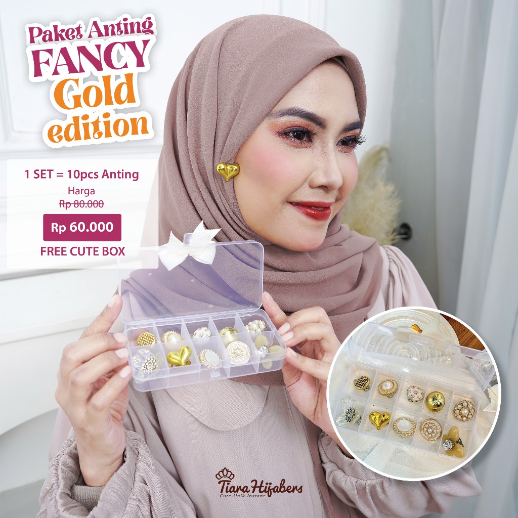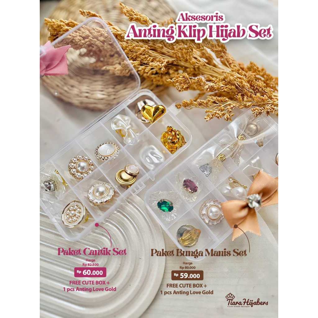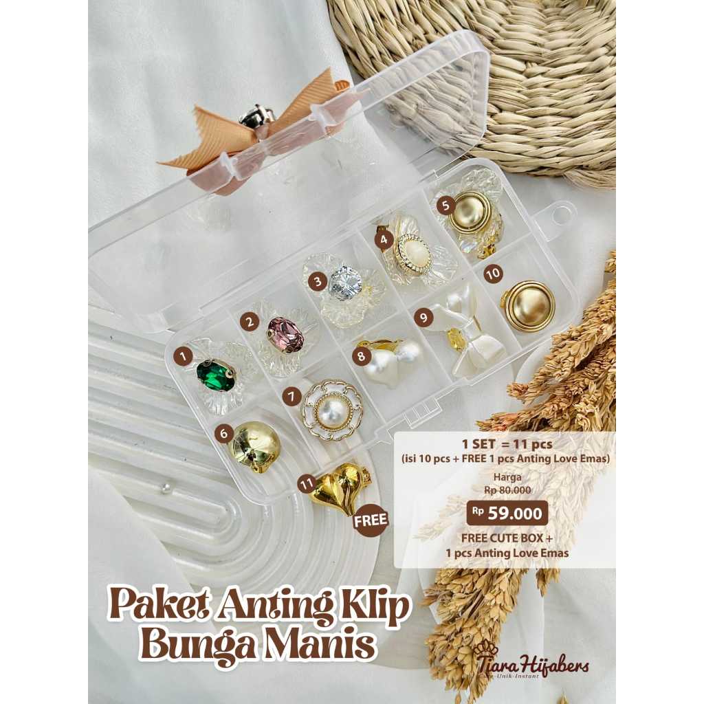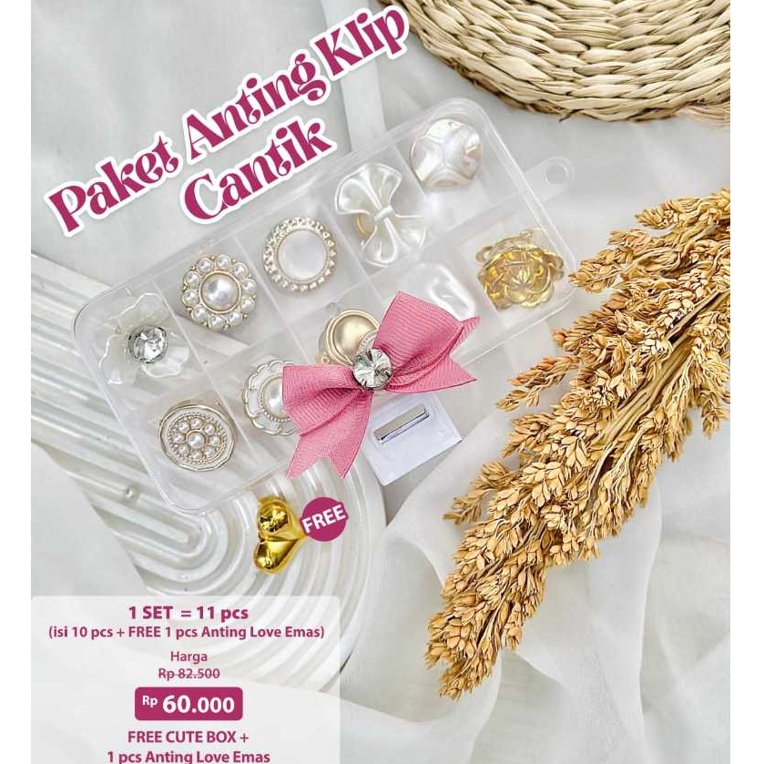 Aksesoris Centil - Aksesoris Anting Klip Hijab 1 SET ISI 10PCS - FREE BOX CUTE PITA & 1PCS ANTING LOVE kuningan mengkilap - Aksesories Kekinian