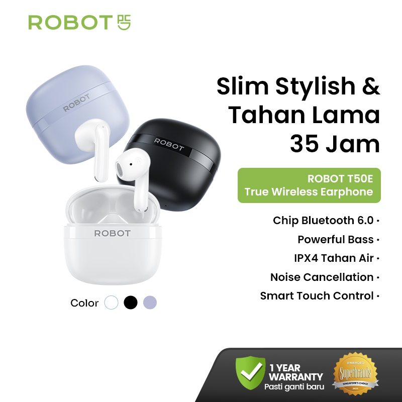 ROBOT TWS Wireless Earphone Earbuds Headset Bluetooth Chip 6.0 True Wireless Earbuds Bluetooth Earbuds IPX4 Waterproof Original - T50E
