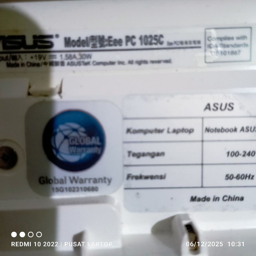 Notebook Asus Eee PC 1025C windows 7 ultimate Mesin Ram1 HDD250 mesin normal tested Casing mulus minus lcd garis gak ada carger