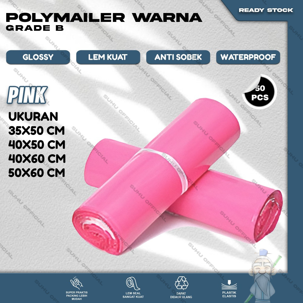 Plastik Packing isi 50 Lembar Glossy Grade B Warna Pink Ukuran 35X50 40X50 40X60 50X60