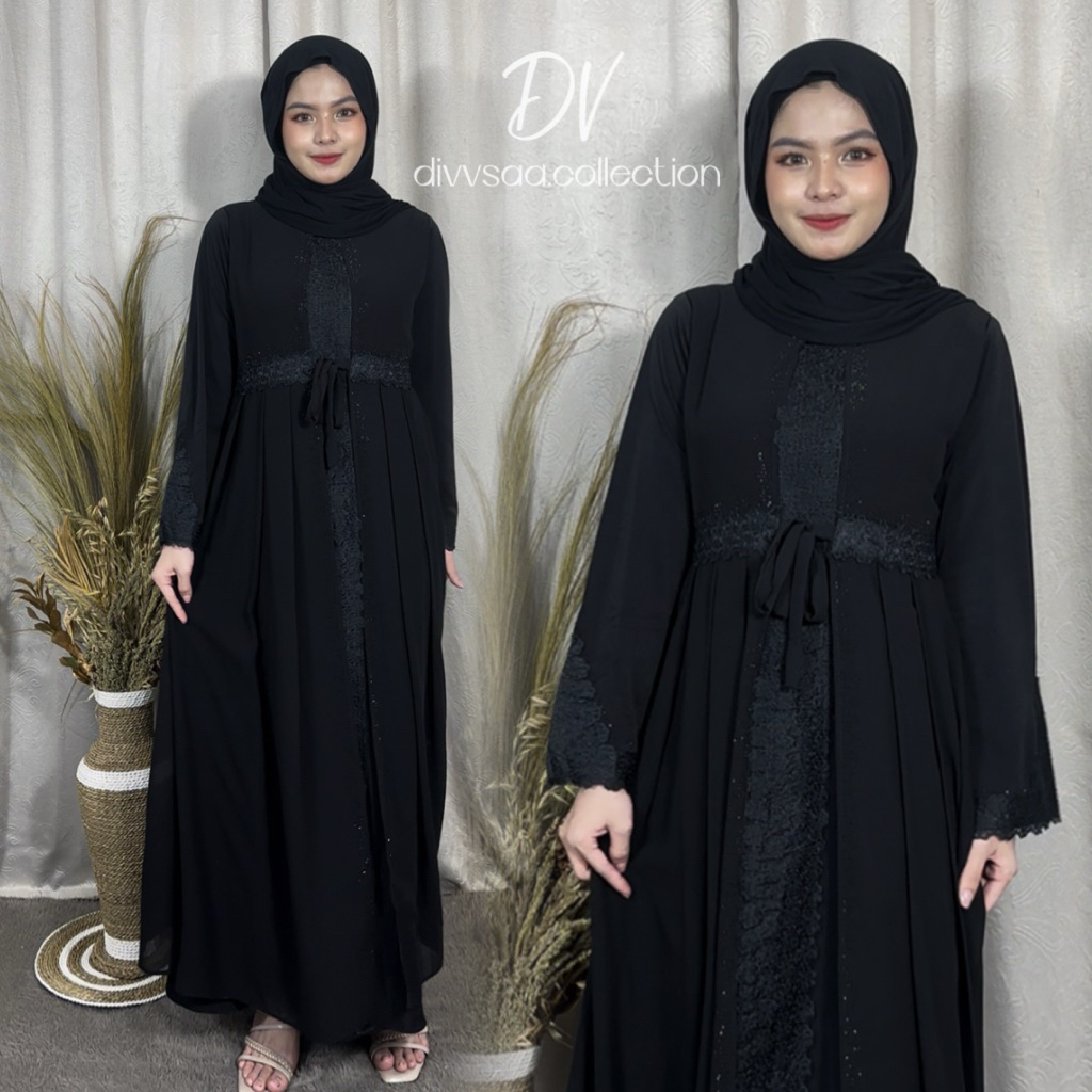 GAMIS ABAYA TURKEY FULL HITAM BORDIR BUNGA TALI DEPAN REMPEL TERBARU TERLARIS DIVVSAA COLLECTION