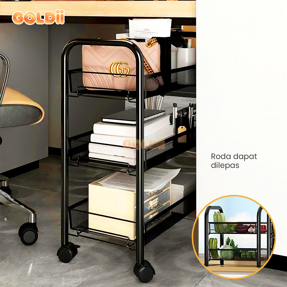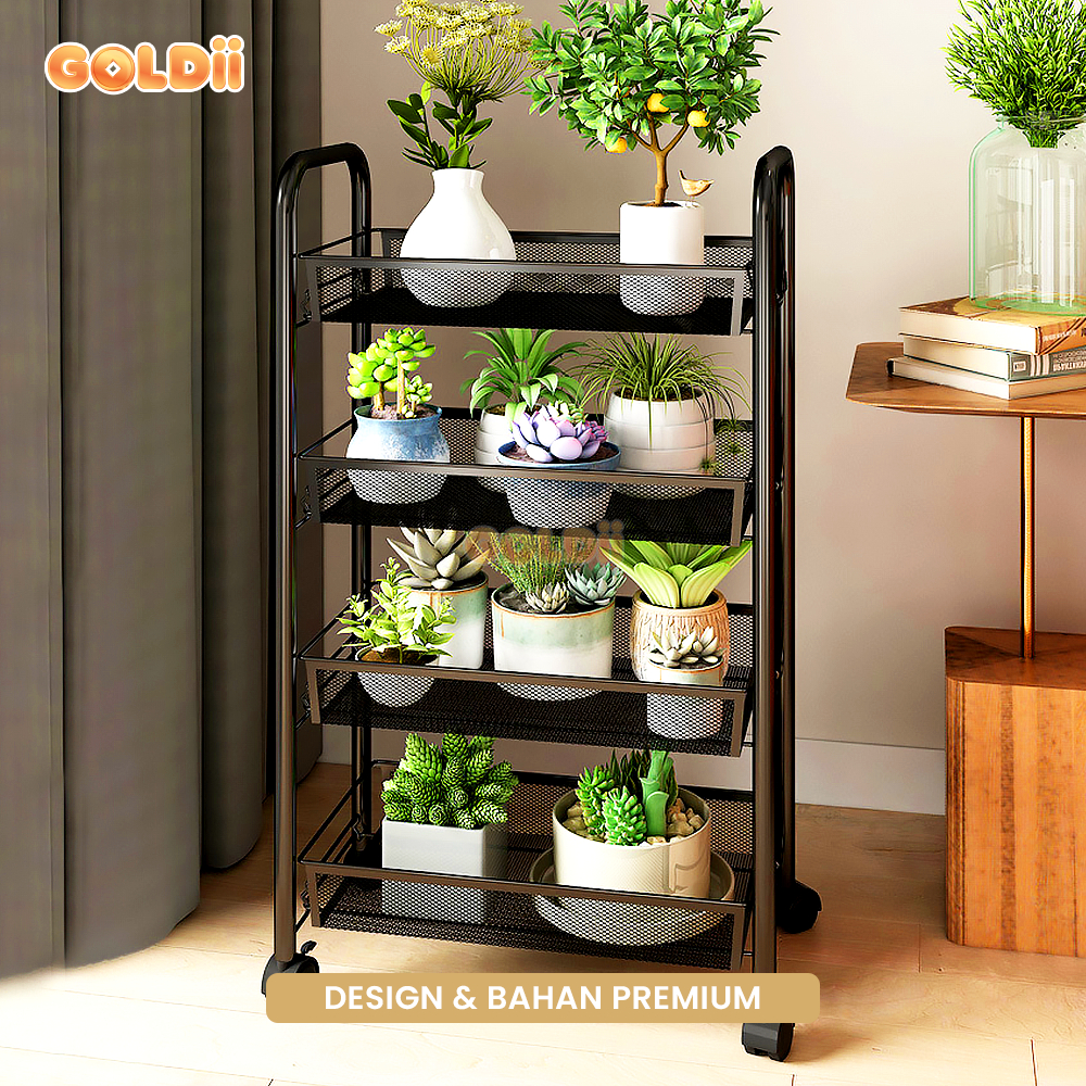 GOLDII - Rak Troli Susun Roda 4 Tingkat Serbaguna Rak Penyimpanan Bumbu Dapur Skincare Buku Multifungsi Besi Premium