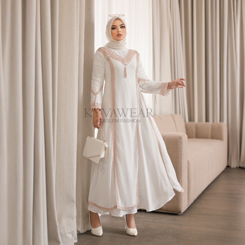 KYVA GAMIS MUSLIM WANITA PUTIH ABAYA RENDA COKLAT TERBARU EDN 019 MEWAH PESTA REMAJA