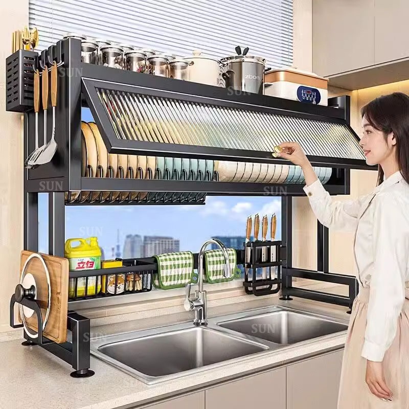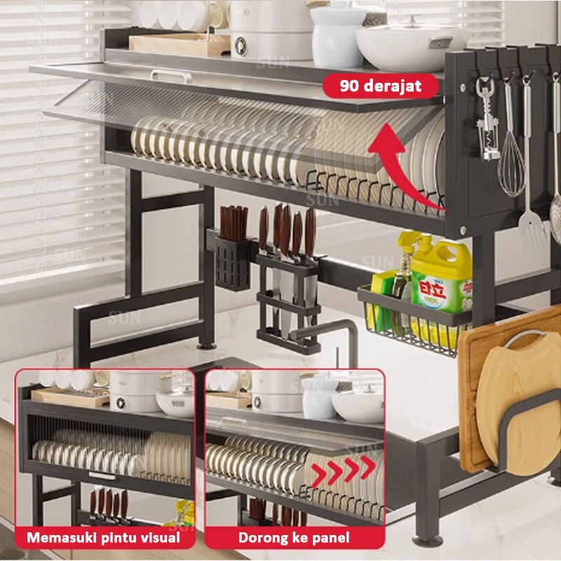 SUN Rak Piring Wastafel Dapur Stainless Steel Multi-fungsi Dengan Penutup
