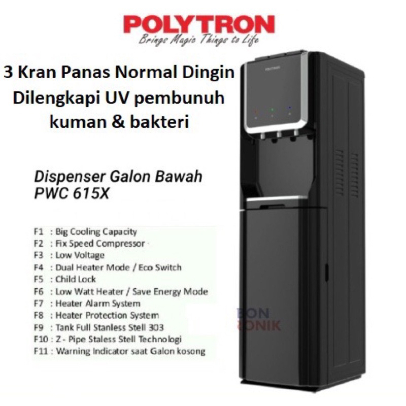Dispenser POLYTRON PWC 615 Galon Bawah 3 Kran Dingin Kompresor