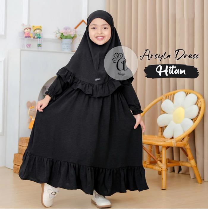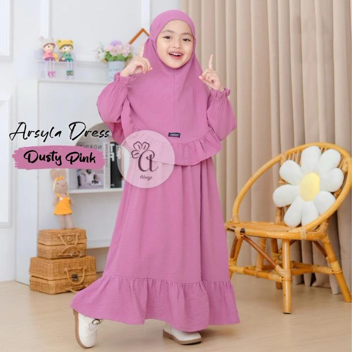 ARSYLA GAMIS MUSLIM BAJU ANAK SATU SET DENGAN KERUDUNG BAHAN CRINKLE - DUSTY PINK, M