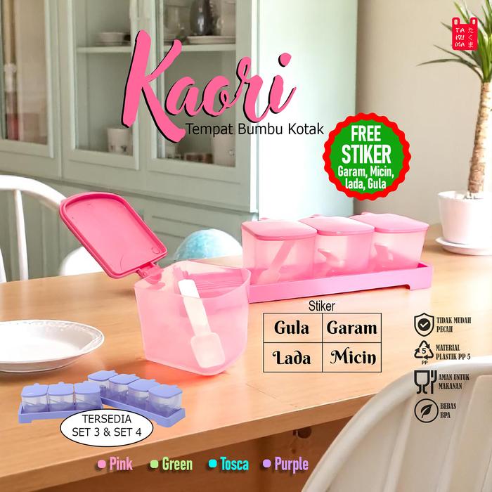SET TEMPAT BUMBU PLASTIK KAORI DARI TAKUMA WARNA PINK, TOSCA, UNGU, DAN HIJAU KITCHENWARE TEMPAT BUMBU DAPUR SET FREE STIKER TULISAN GARAM MICIN GULA LADA - PINK, 3