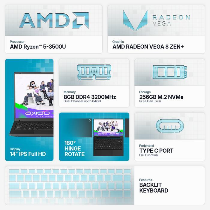 [Star]Laptop Axioo Mybook HYPE 5 X3 AMD Ryzen 5 RAM 8GB 256GB SSD 14" FHD IPS Windows 11 Resmi Axioo + ADP PROMO - Blue