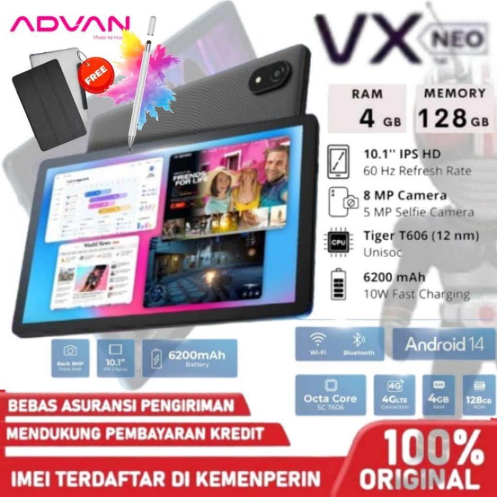 AdvAN VX NEO 4+128GB 10.1" IPS Screen Tablet Android 14 6200 mAh Free Flip Cover GARANSI RESMI
