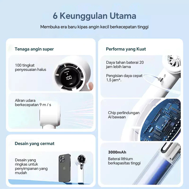 Kipas Genggam Mini Kipas Turbin Mini Portabel 100 Kecepatan Kipas Isi Ulang USB 10000 RPM Cocok untuk Kantor/Perjalanan/
