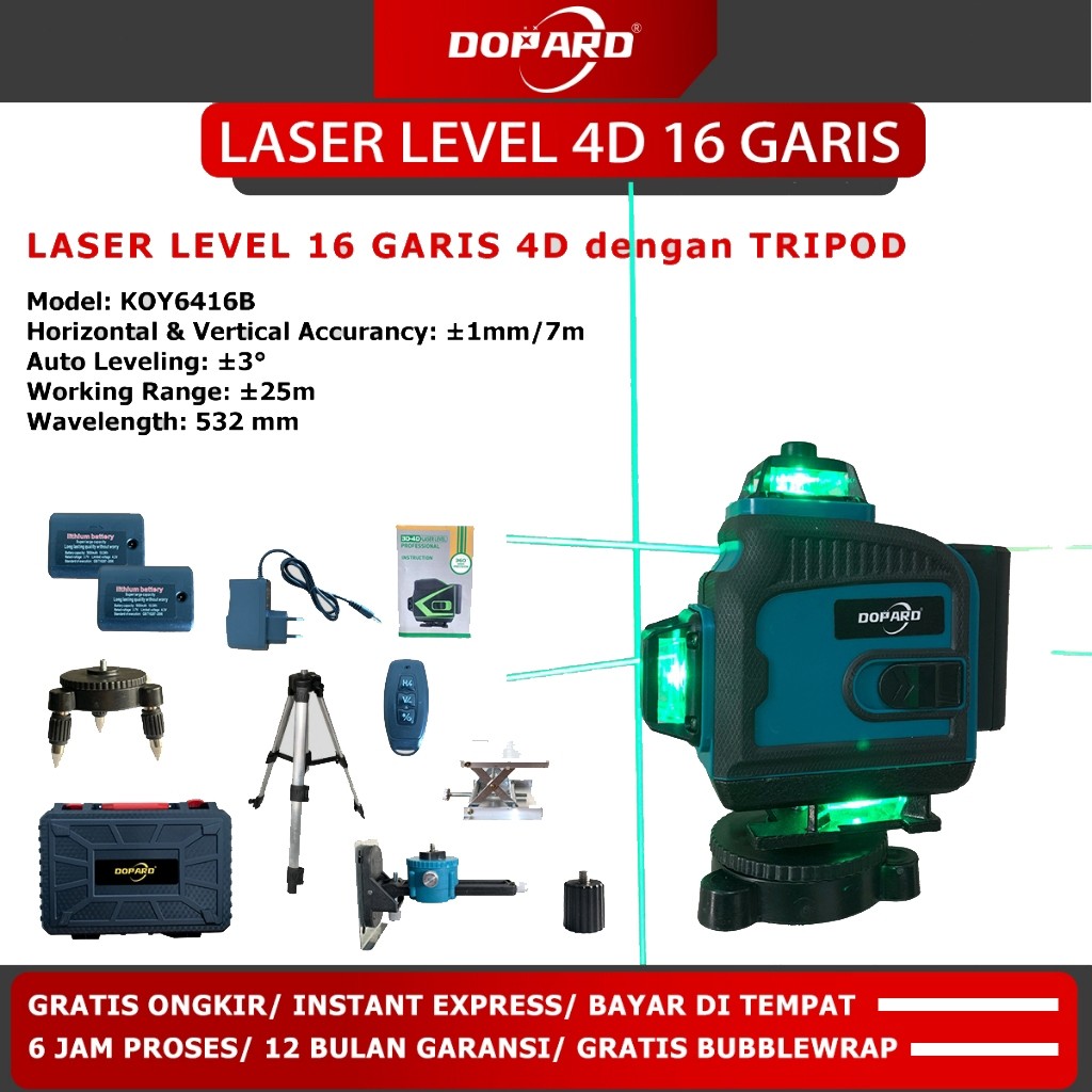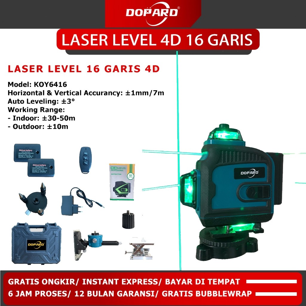 DOPARD Laser Level 4D 16 Line Self Level Garis Pakai Remot Baterai Tingkat Self leveling 360° Laser